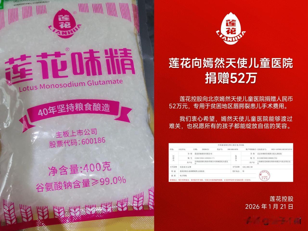 王菲捐3000万我没意外, 李国庆捐100万也觉得正常, 唯独看到从小吃到大的莲花味精捐了52万,我直接破防到眼眶发热。 这个曾占据家家户户灶台、却被谣言推进灰尘里的名字,竟在儿童医院的求助声中,捧出了自己的全部体温。 我经常关注他们直播间 ,一个官方直播间只有二三十人观看,就这还在捐款,有零有整,恐怕是把自己零零碎碎的家底全掏出来了吧。 我这边有的超市都不卖了,可能嫌它太便宜了,毕竟3元一袋,可以吃好久。 这52万的善款,得卖多少袋味精,才能筹到啊,自己都这么难了,还捐款,真是了不起的企业!