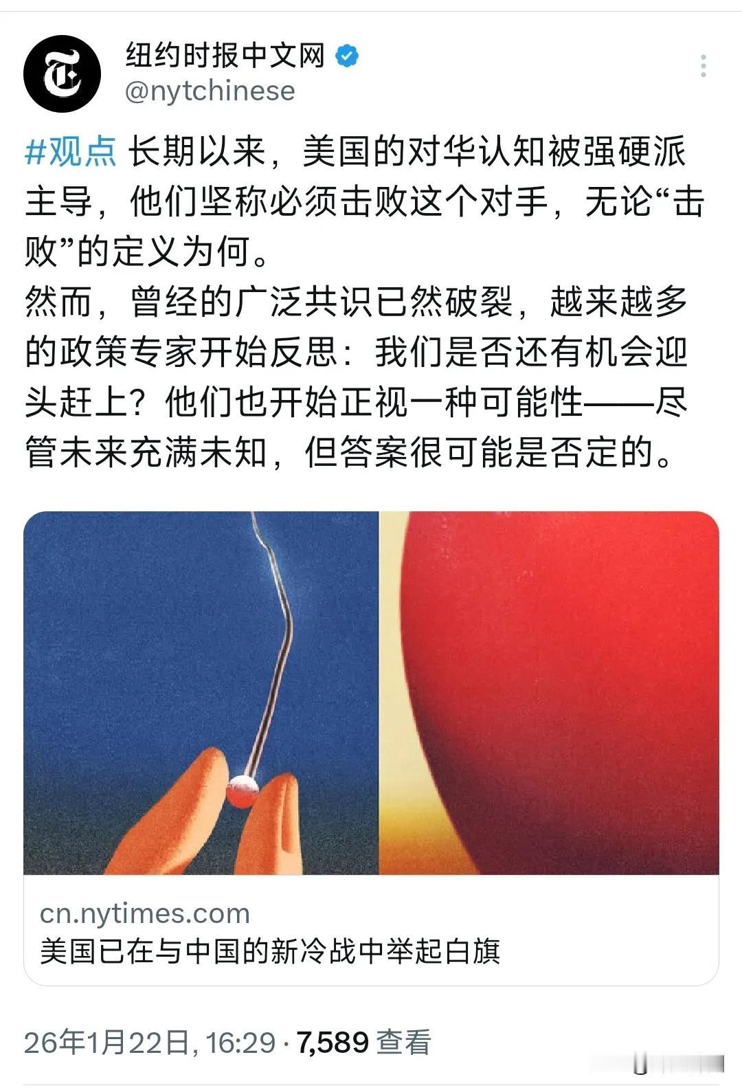 纽约时报称美国对华举白旗,是真心认输还是甩锅遮羞? 《纽约时报》1月22日重磅表态,直言美国已在对华新冷战中举起白旗,甚至连迎头赶上中国的机会都寥寥无几! 可这话真的可信吗? 这哪里是单纯认怂, 分明是美国精英层的甩锅大戏, 更是内心慌了的刻意伪装! 长期被强硬派绑架的美国, 张口就要“击败中国”, 却连“击败”的定义都说不清。 十年围堵、脱钩、拉帮结派搞对抗, 反倒被中国稳步拉开差距! 《纽约时报》的这番表态, 看似戳破现实,实则藏着美国的小心思。 如今美国专家集体反思“追不上”, 看似低头认输, 实则是把对华政策失败的锅,全甩给了强硬派! 温和派早干嘛去了? 对华再挂钩喊得震天响, 到头来还是跟着强硬派搞技术封锁、打关税战, 从未真正理性对待中国! 更具争议的是, 美国真的是单纯“追不上”吗? 政治极化持续撕裂, 两党拿对华政策当筹码相互撕扯, 特朗普时期政策反复,拜登政府接手后难挽颓势, 盟友离心离德,连自家核心产业都守不住! 中国的进步, 是靠自己埋头苦干拼来的, 从来不是美国“让”出来的! 《纽约时报》口中的美国所谓“举白旗”, 不过是打不赢、追不上, 又不愿承认自身腐朽的遮羞布! 有人说这是美国的理性回归, 但这说法根本站不住脚! 若真有理性, 就该立刻停止,放下霸权傲慢! 若只是甩锅避责, 这面白旗,不过是霸权衰落的遮羞布, 更是美国酝酿下一轮阴招的铺垫! 美国举白旗是真心认输,还是酝酿阴招? 这波操作的小心思,你更认同哪一种?