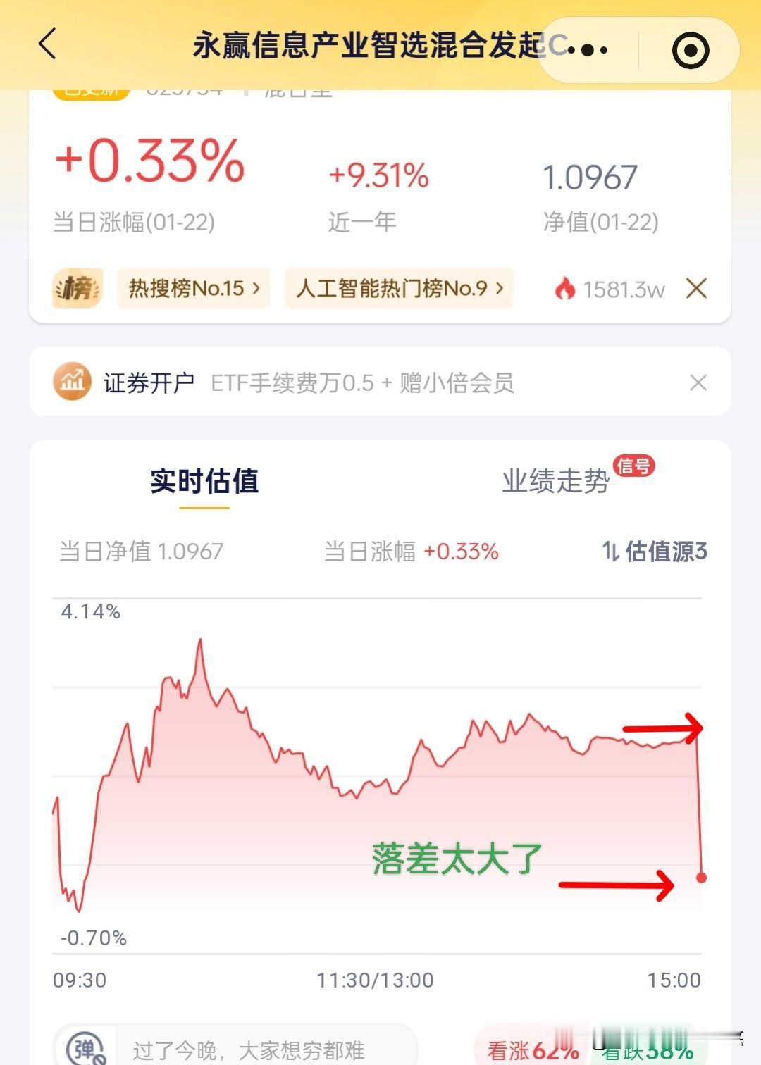 好不容易等到AI应用板块企稳反弹,这个基金净值出来以后,却大失所望,太拉色了。今天指望它能搬回败局,可是、可是它比申万菱信差近2%,比稳赢差超1%,连板块涨幅都没有跟上,按它公布的最新持仓来看,今天涨幅起码要有1.5%以上,才0.33%!怎么越调仓越差劲,还不如原来持仓。这个基金经理特点就是进攻性强,能涨能跌。从现有持仓也可以看出来,大都是科创及创业板20厘米股票,再忍忍看,观察一段时间再说吧,否则转到其它!