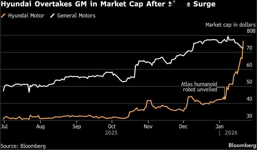 机器人业务助力,现代市值超越通用 现代汽车股价大涨15%,市值首次超过100万亿韩元,一举超过通用汽车,成为全球市值第四的汽车制造商。而助推现代股价大涨的主要因素,是人工智能业务。 CES期间现代大秀人工智能硬件,特别是以Atlas人形机器人开发商Boston Dynamics为中心的机器人业务。现代计划从2028年开始在制造工厂部署人形机器人,并计划在全球每年生产30,000台Atlas,为其创造约40亿美元的额外收入。 这也解释了为何包括特斯拉、小鹏等在内的汽车制造商都在积极布局人形机器人业务。【来自懂车帝车友圈】