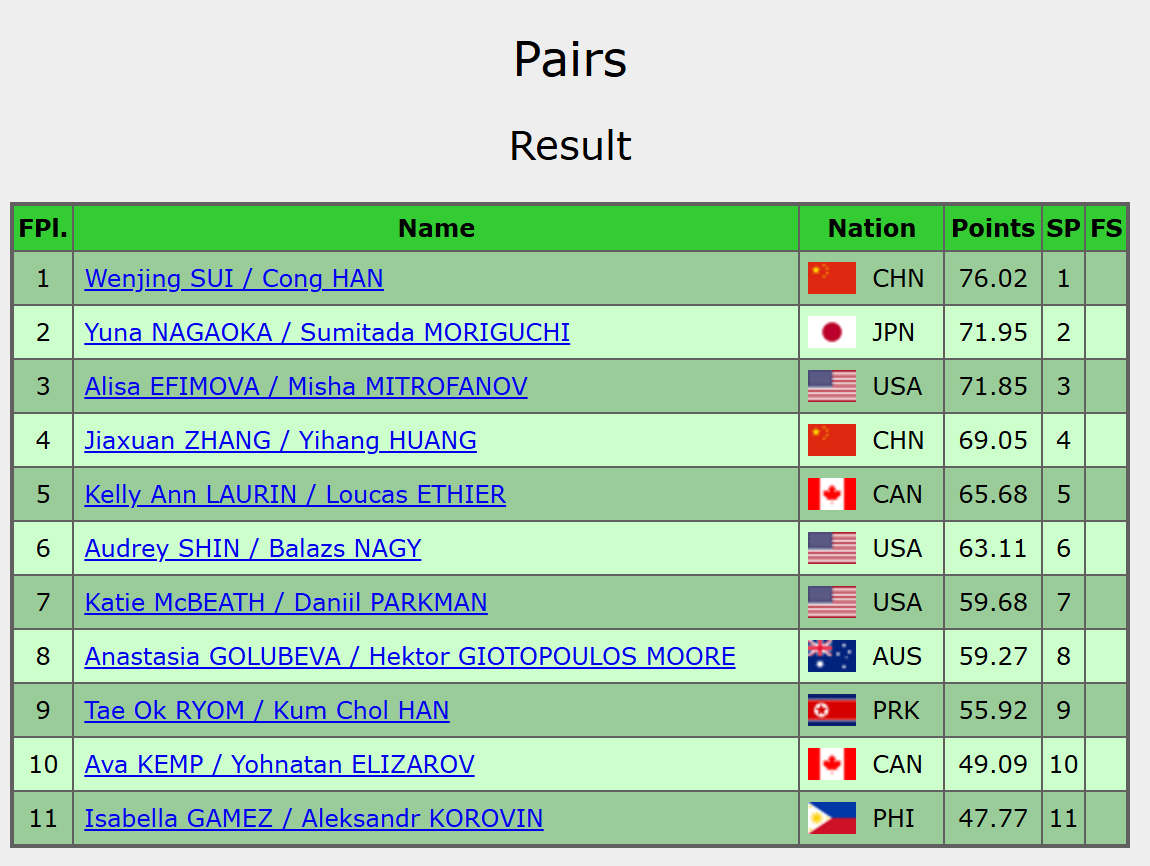 日本组合长冈柚奈/森口澄仕位居次席,美国组合叶菲莫娃/米特罗名列第三。