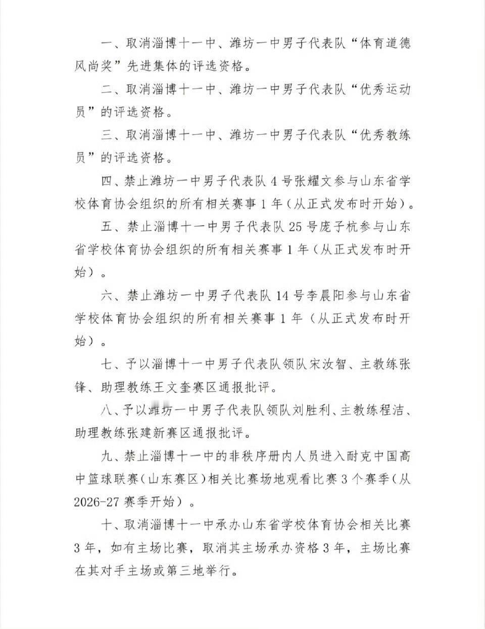 篮协怎么又双标了?2025-2026耐高山东赛区男篮决赛,淄博十一中和潍坊一中在比赛中发生大规模打架事件,球员家长都冲入场地内参与斗殴,如此恶劣的赛场打架事件,最后只是给与主要参与打架三名球员禁赛一年的处罚,而且禁赛的范围是山东省学校体育组织的比赛。 联想到之前辽宁和山东U22联赛的打架处罚可是按照禁赛三年的顶格处罚执行的,并且提到类似赛场打架事件都是零容忍杀无赦,这回怎么篮协就手软了呢?难道因为没有辽宁队参与就从轻发落了? 同样的赛场群起打架事件,不一样的处罚标准,请问这样的双标处理结果如何服众呢?难道篮协处罚是看人下菜碟吗?