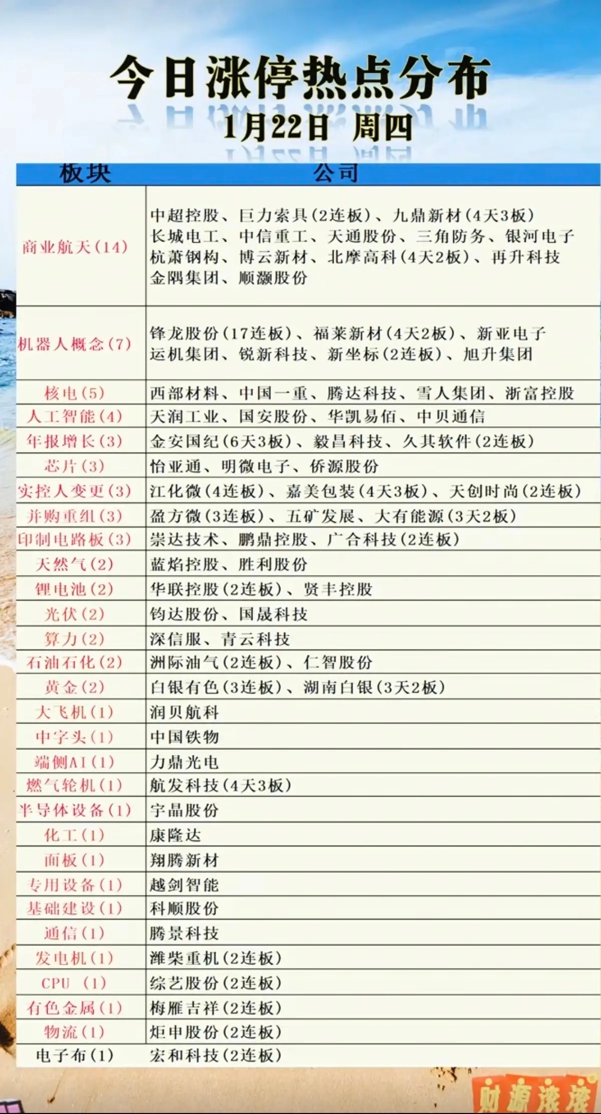 1.22周四 涨停板股票:题材+高度!机器人 锋龙股份17板市场热点方向:核电+航天+年报预增商业航天 14股涨停机器人 7股涨停核电核能 5股涨停人工智能 4股涨停半导体芯片 3股涨停