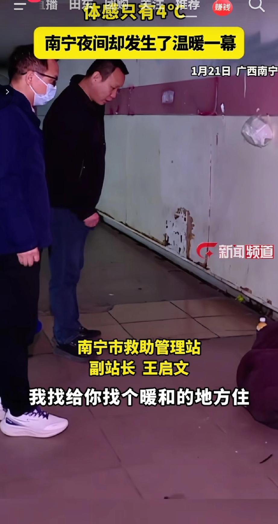 1月21日,广西南宁体感温度仅4℃,南宁市救助管理站开展“寒冬送温暖”专项救助行动。工作人员在夜间为流浪人员发放衣服、鞋子、袜子等生活物资,邀请流浪人员前往救助站接受免费帮助,有需要救助的也可以拨打热线0771 - 5615277,呼吁市民发现流浪人员及时拨打,让需要帮助的人感受到温暖。(来源于@广西新闻频道 )