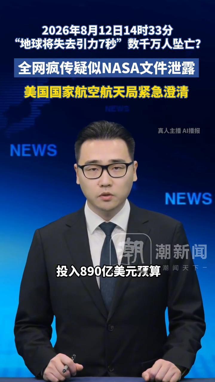 2026年8月12日14时33分,"地球将失去引力7秒"数千万人坠亡?全网疯传疑似NASA文件泄露,美国国家航空航天局紧急澄清。 潮新闻主持人胡杨。 8月12日地球将失重7秒?致4000万人坠亡?疑似NASA文件泄露,NASA紧急回应"当日确将有异象"。 近日一则"地球将失去引力7秒"的"阴谋论"在国内外社交媒体上疯传,相关说法宣称2026年8月12日14时33分地球将短暂出现失重,并渲染称可能造成约4000万人坠落身亡。NASA甚至声称NASA已为应对灾难投入890亿美元预算修建地下掩体等。 对此美国国家航空航天局出面辟谣,强调该传言毫无科学依据。NASA官员证实当天确实有日食等天象,但不会对地球引力造成影响。