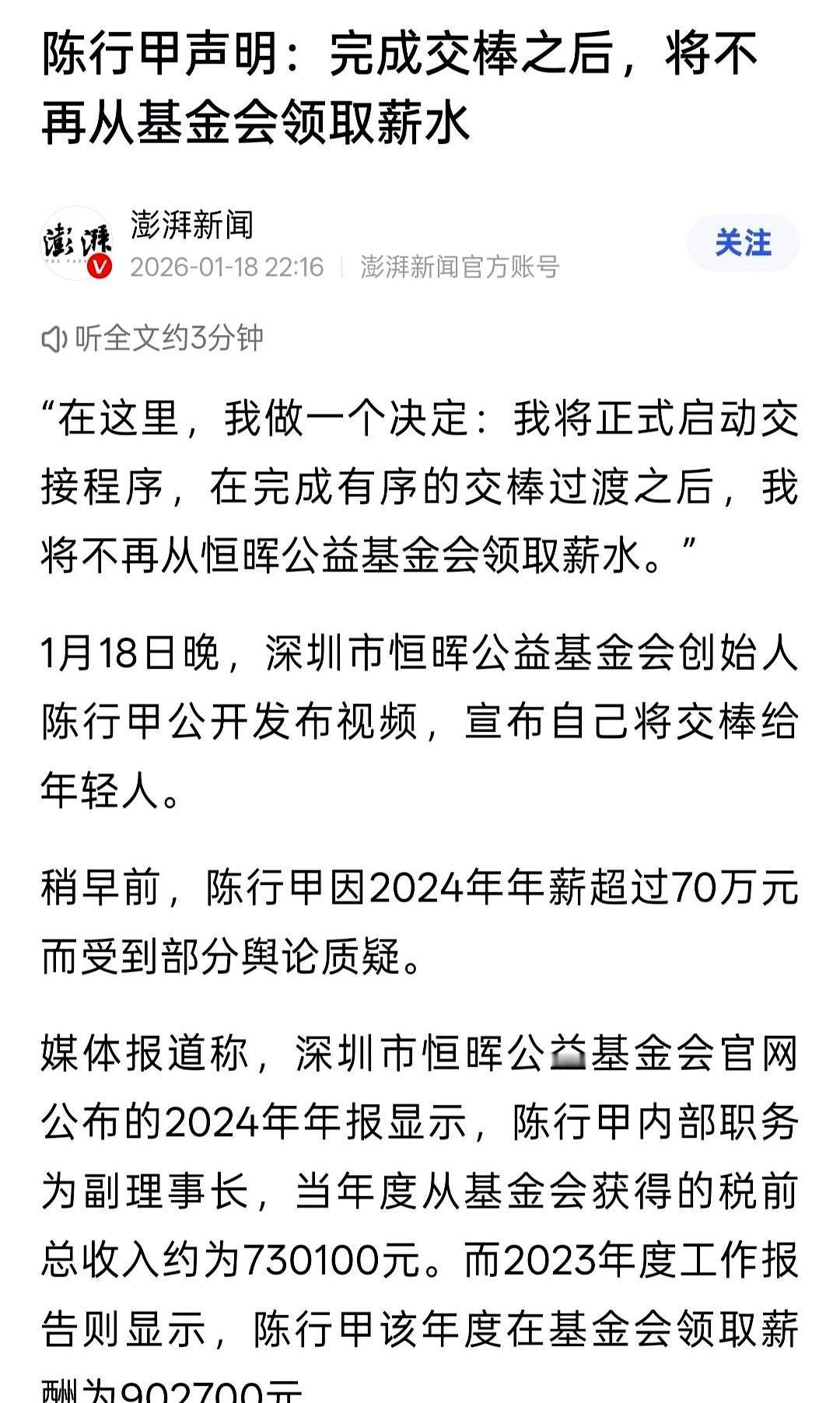 一家三口,整整齐齐,从自己开的公益基金会里领工资。 而且是每年大几十万那种。 这画面,想想就觉得哪儿不对劲。 我还记得当初,朋友圈里刷屏的那个“反腐英雄陈行甲”。清华高材生,放弃高官厚禄,一头扎进公益的泥潭里。多感人啊,多纯粹啊。 我们当时是真的信了。 多少人热泪盈眶,多少人买了他的书,觉得终于看到了一个不为钱的“圣人”。我们把一个理想的、完美的壳子,亲手给他套上了。 说白了,大家反感的根本不是他挣钱。 他有那个能力,当过县委书记的人,去大公司当个高管,年薪几百万上千万,谁会说个不字?大家只会佩服,这是本事。 可问题是,你不能一边举着“公益”这面最干净的大旗,接受着普通老百姓一块两块、一百两百凑起来的善意。 一边又把这善意,变成了自家的“家族企业”工资单。 这就不是挣钱了。 这是在消费所有人的信任。 你让那个省吃俭用捐了50块钱的阿姨怎么想?你让我们这些曾经为你摇旗呐喊的人怎么想? 感觉像个傻子。 现在舆论大了,他宣布不领工资了。 挺好。 但有些东西,碎了就是碎了。 信任这玩意儿,建立起来需要好多年,需要无数个动人的故事。 但毁掉它,一张工资条就够了。