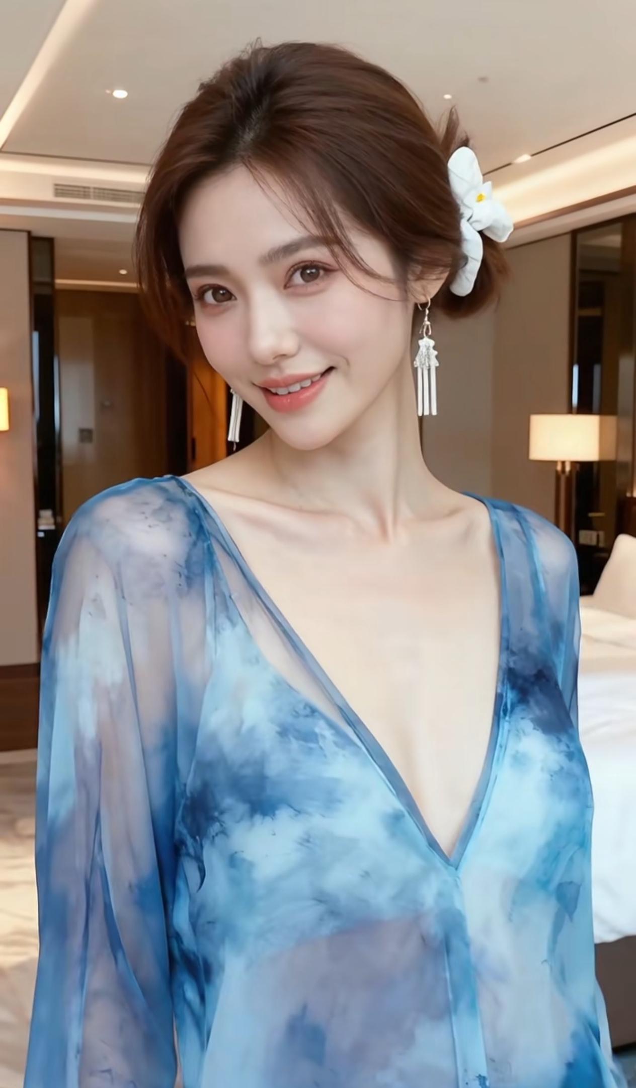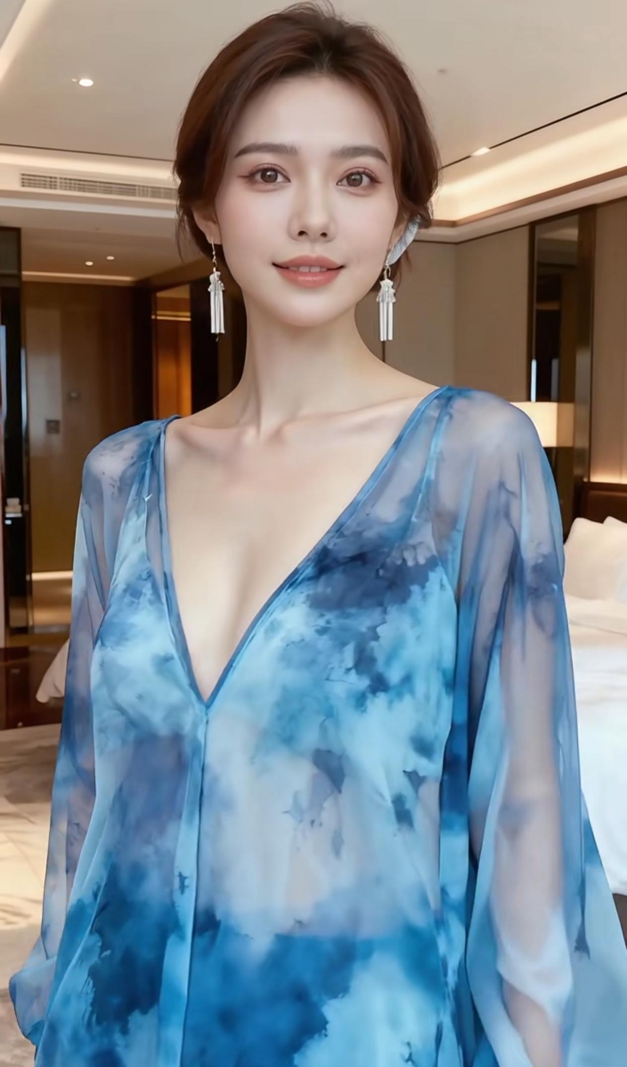 融合传统与现代审美的古风服饰,内层是一件湖蓝色裙,裙身点缀着精致的金色缠枝花纹刺