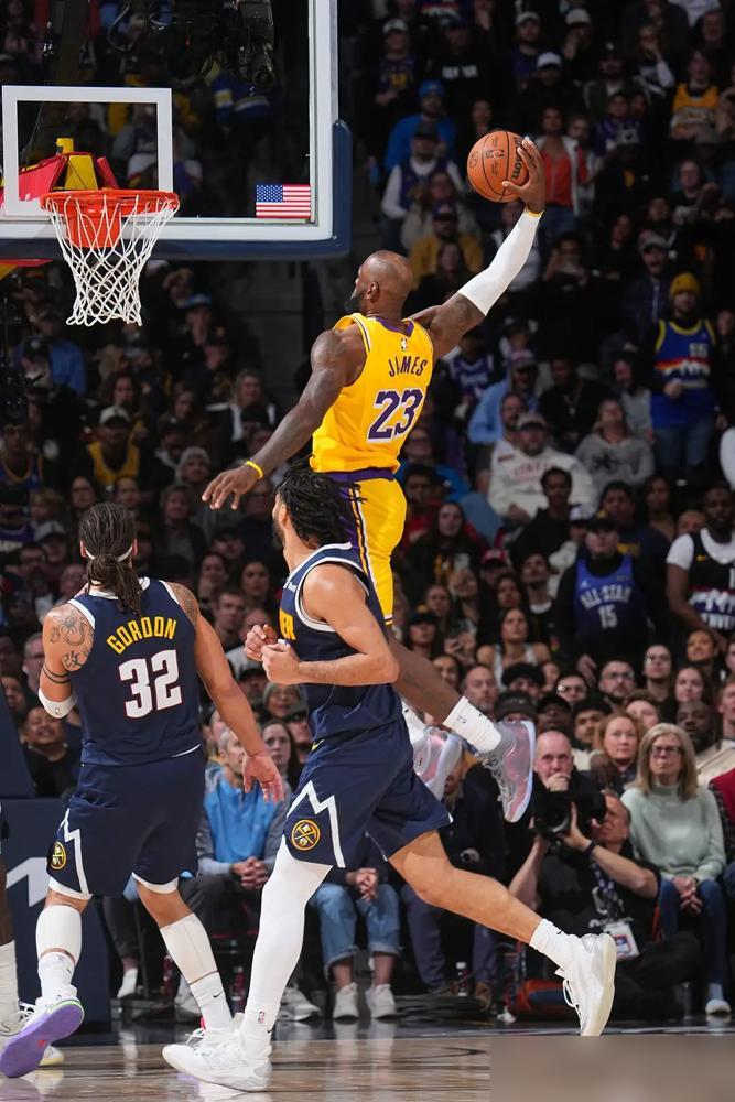 瞧瞧这老汉,41岁了还要把人家的篮架子砸出哀鸣,简直不给自然规律留一点面子。 湖人落后16分的时候,我以为这帮老弱病残已经准备收工吃宵夜了。谁能想到,这岁数的勒布朗还能整出一记战斧重扣,直接把丹佛主场的喧嚣给锁喉了。那两分钟的爆发,他根本没打算活在碳基生物的生物钟里。 19分、9篮板、8助攻,数据看着依然全能。6次失误确实显出零件生锈了,脚步也透着沉重。可当他接到球加速起跳那一刻,感觉他把攒了十几年的退休金全拿出来付了体能小费,时间在那一秒彻底哑火。 打到第23个赛季还能这么横,这种硬核的倔强,早就跟单纯的胜负没关系了。他是在用这种最原始、最粗暴的方式,当面调戏地心引力。 这记扣篮扣下去,震碎的不只是掘金的翻盘梦,还有所有人对他“廉颇老矣”的刻板预期。