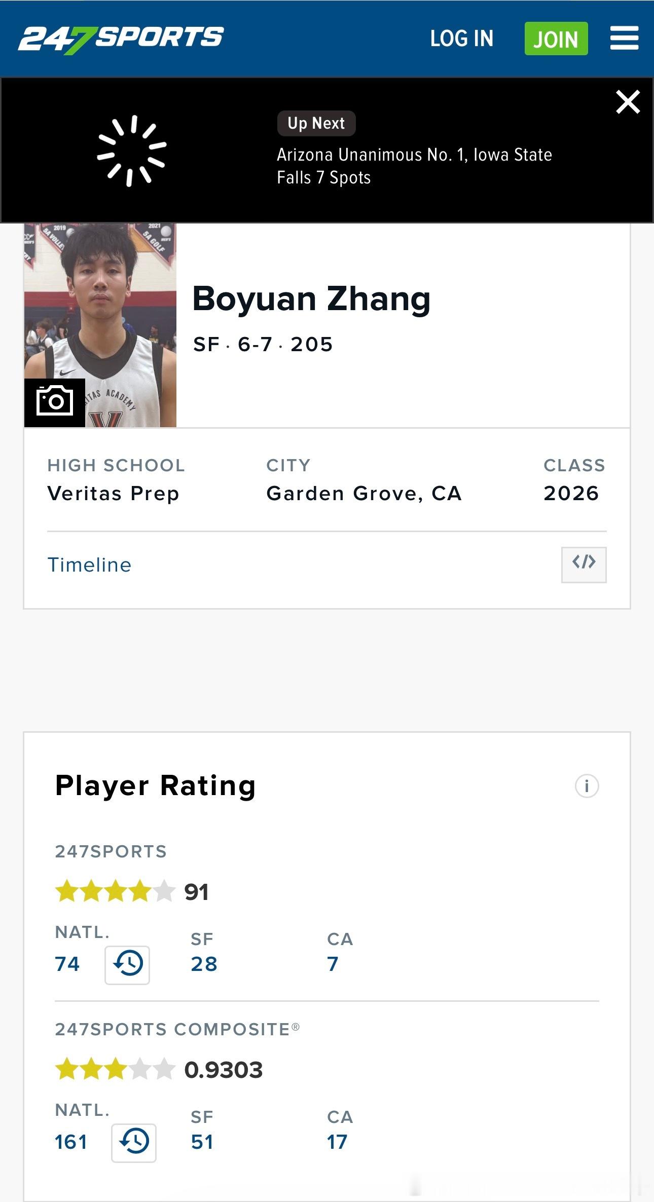 247sports更新2026届全美高中生榜单。张博源首次进入Top150,并一跃超越郇斯楠定星全美四星高中生,最新全美排名74位(上一期排名全美195位),郇斯楠全美排名81位张博源郇斯楠NCAANBA