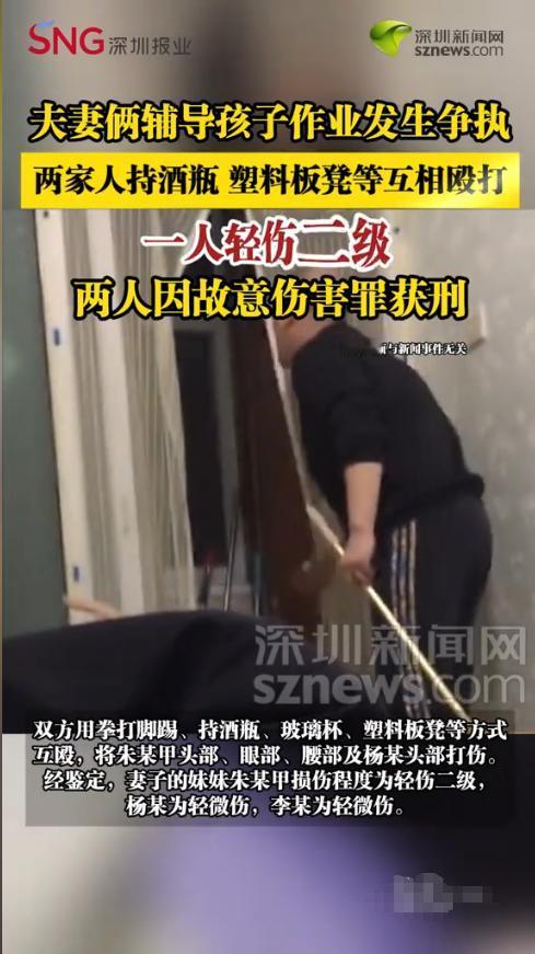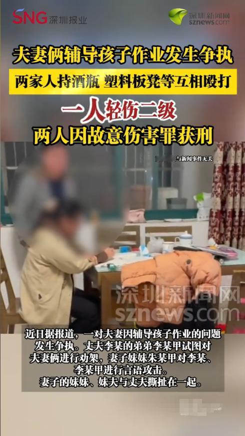 “离了个大谱!”2019年11月,山东临沂,一对夫妻在辅导孩子作业时发生了争执,二人随后就叫来各自亲戚“助阵”,没想到事态升级,两家人竟开始持酒瓶、塑料板凳互殴,最后一人轻伤二级,两人因故意伤害罪获刑!网友:至于吗? 辅导孩子作业,向来是不少家庭的“头号难关”,一开始可能只是对着磨磨蹭蹭的孩子生气、上火,可情绪一旦失控,战火容易蔓延到家人身上。 据媒体报道,这天晚上吃过晚饭后,夫妻两人开始辅导孩子写作业。可没想到中途二人却因为辅导方式不同产生了分歧,一开始还只是小声拌嘴,后来越吵越凶,情绪彻底失控。妻子觉得丈夫方法不对,丈夫嫌妻子太啰嗦,两人从书房吵到客厅,声音越来越大。 两人谁也不肯退步,于是妻子叫来自己妹妹,丈夫叫来自己的弟弟,都让他们帮忙评评理。一开始被叫来的弟弟妹妹还上前劝架,可也不知是谁先动了手,两家人瞬间扭打在一起,有人抄起酒瓶、玻璃杯砸向对方,有人拿起塑料板凳猛挥,场面混乱不堪。 最后直到警方介入才收了手。经鉴定其中一人为轻伤二级;另一人头部受伤,为轻微伤。最后动手者因故意伤害罪被判刑。 网友看后表示,本来辅导作业是夫妻间的事,这下好了小事闹成了刑事案件,还有人说,本来是为了孩子好,结果大人先打起来,孩子心里得多有阴影。 信息来源:《[夫妻俩辅导孩子作业发生争执,两家人持酒瓶塑料板凳等互相殴打]两人因故意伤害罪获刑》深圳新闻网