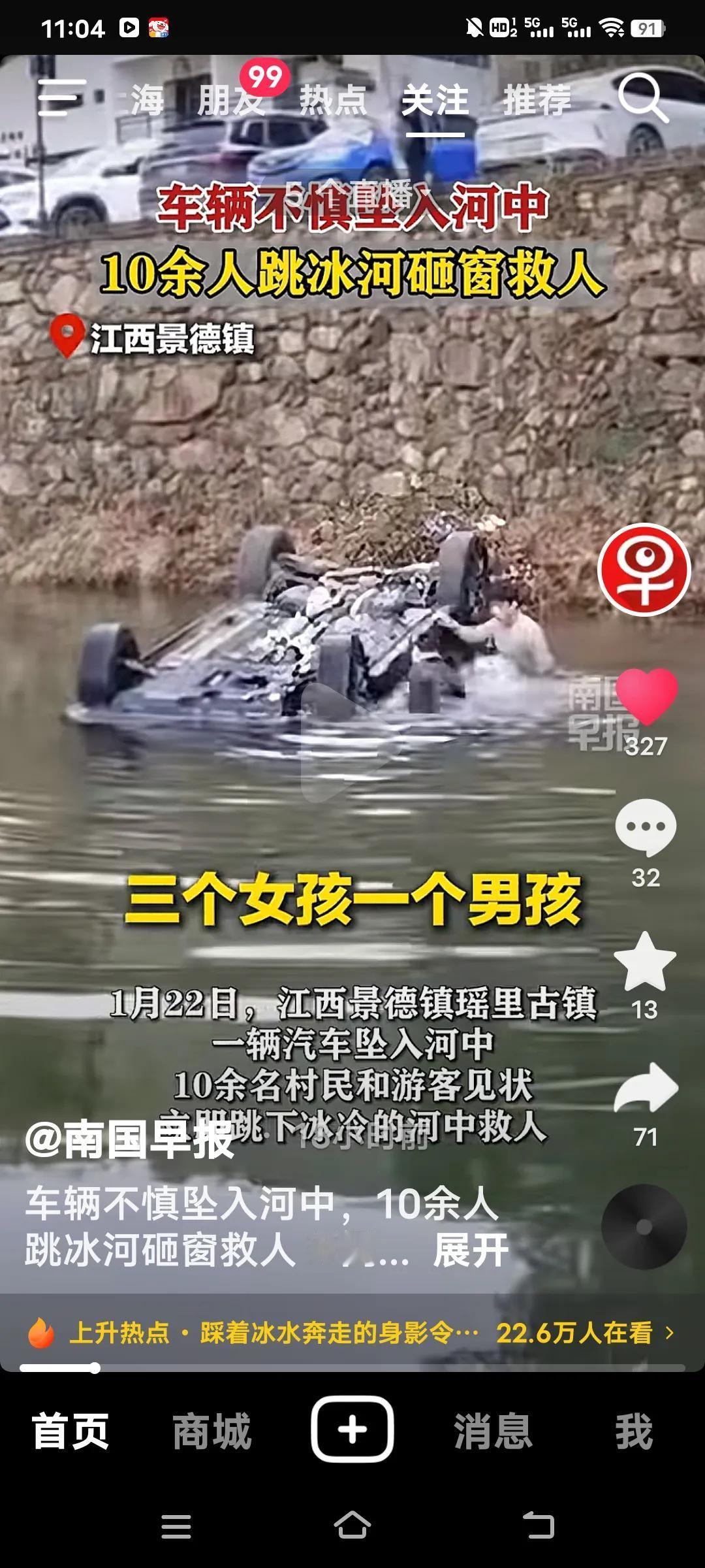 2026年1月22日,江西景德镇上演了惊险的一幕。一辆车不慎坠入水中,车内四名人
