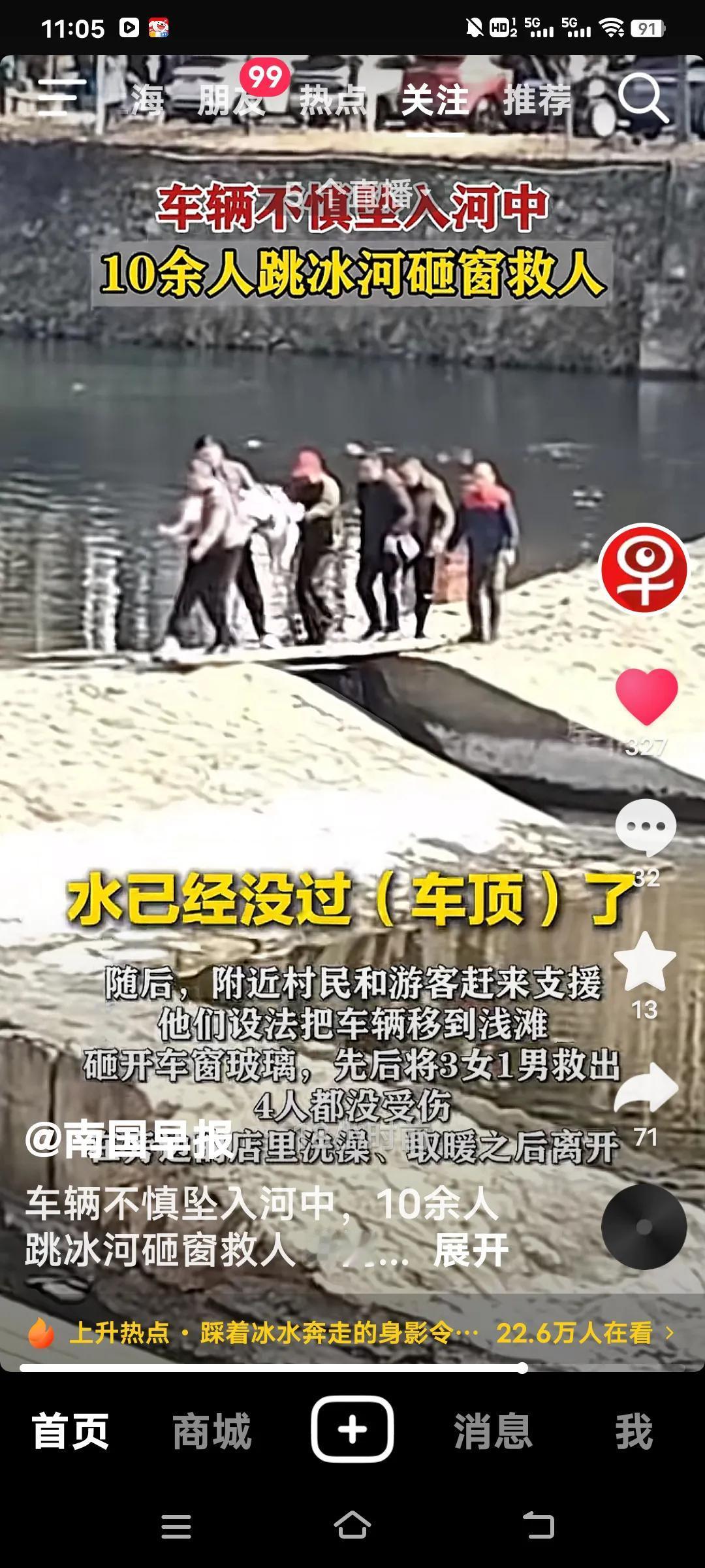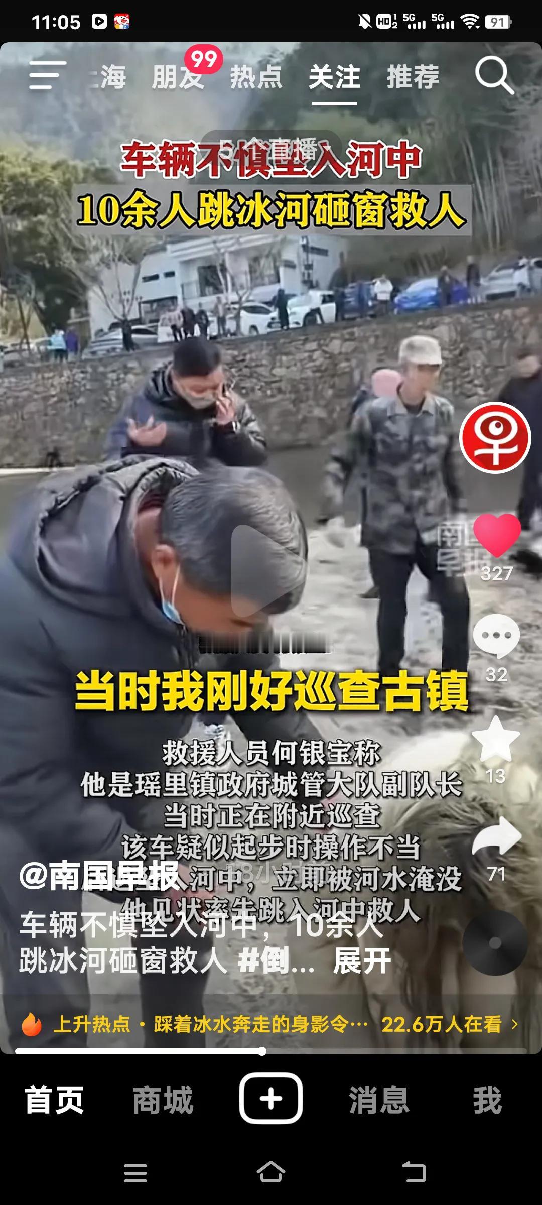 2026年1月22日,江西景德镇上演了惊险的一幕。一辆车不慎坠入水中,车内四名人员被困。情况万分危急,十多名村民和游客迅速反应,直接跃入水中展开救援行动。 参与救助的银宝表示,他是瑶里镇的城关大队长,当时正在巡逻。这辆车疑似因操作不当坠入河中,瞬间就被水淹没。他率先跳入水中救援。附近十多名村民和游客赶来增援,大家一起将车移至浅滩,砸碎车窗玻璃,先救出了车内的三名女性,再救出一名男性。所幸四人都未受伤。 在众人齐心协力的努力下,四名被困者均安然无恙。这些村民勇敢无畏,在危急时刻挺身而出,他们就是现实生活中的英雄! 真要为这十多位英雄点赞!要知道,当时天气十分寒冷!但关键是,所有人都平安无事,他们的付出没有白费,真是太好了!景德镇事故