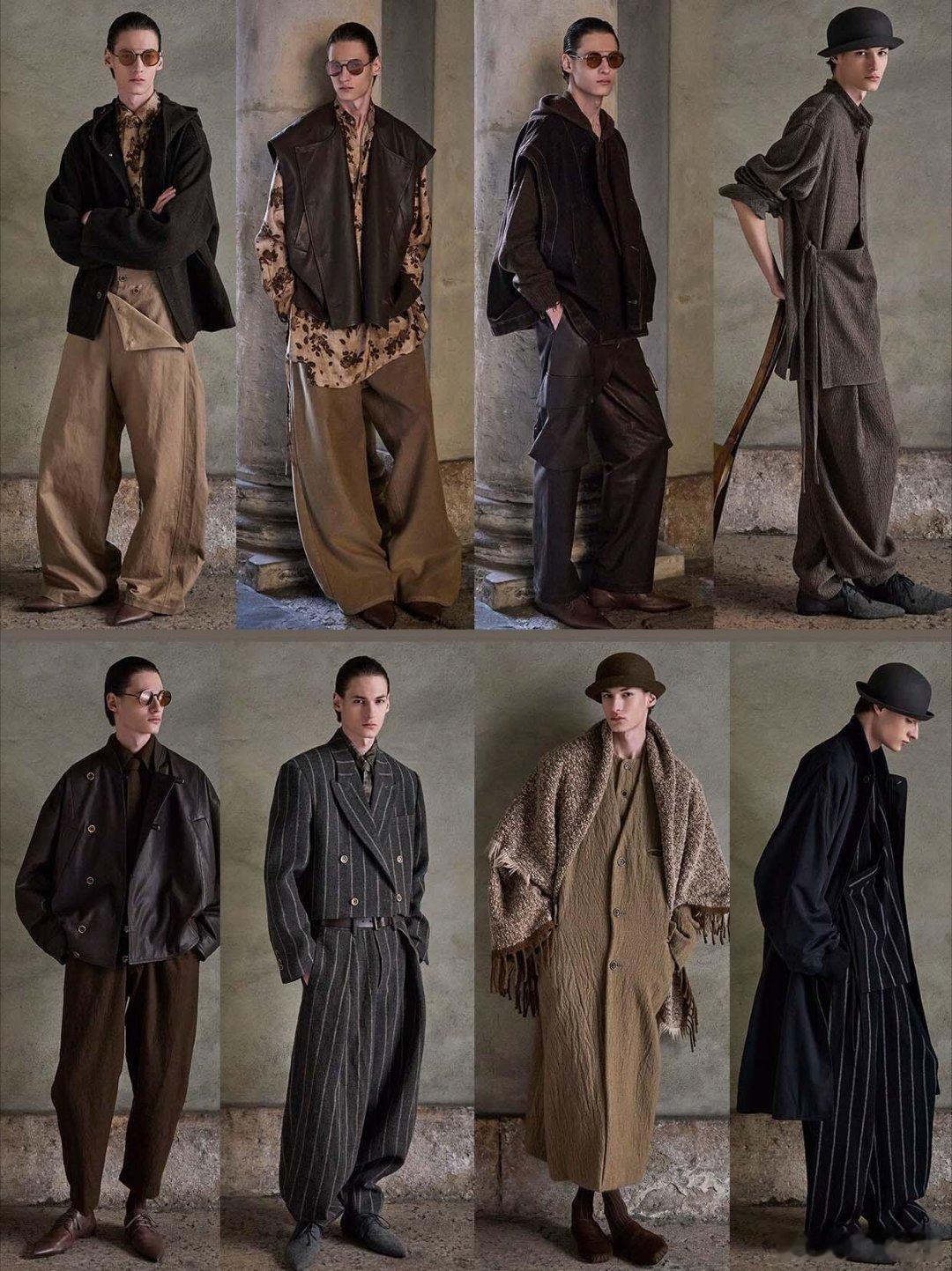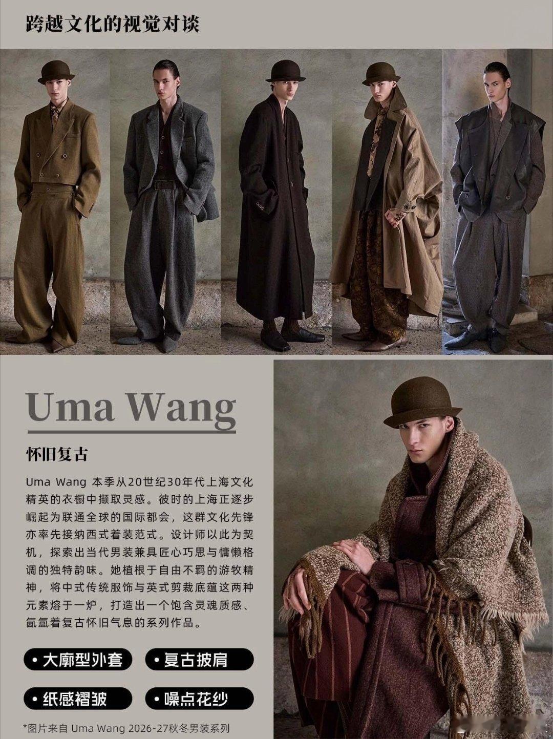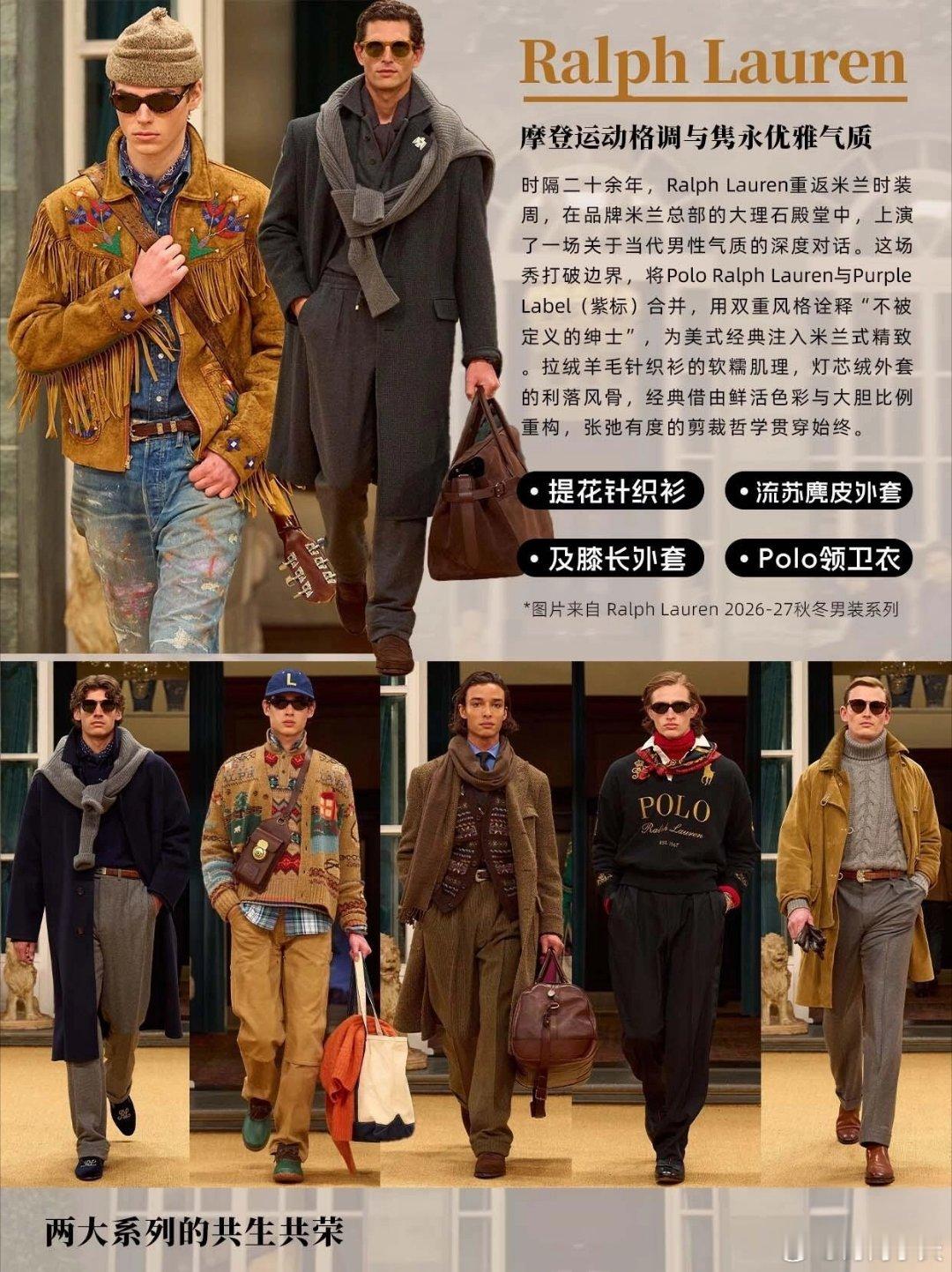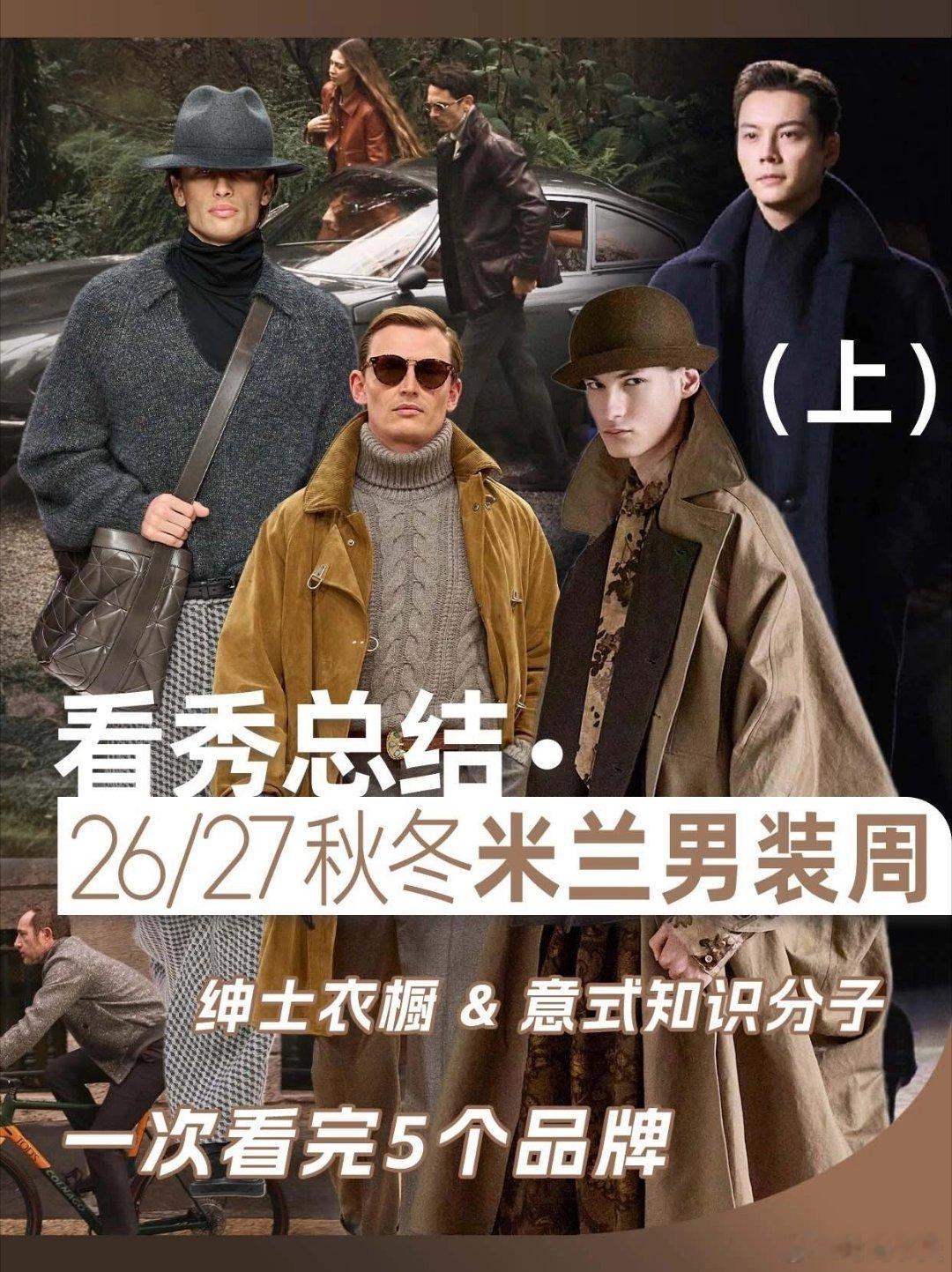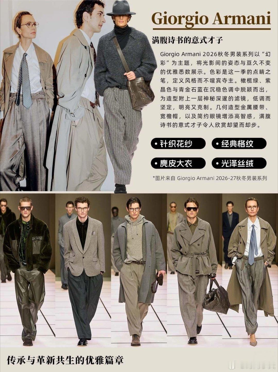26 - 27秋冬米兰男装周精彩看点(上)2026秋冬米兰男装周在动荡时局下,男装设计从追新潮转向探索延续与传承,更注重实用性、舒适感与情感慰藉。以下5个品牌给我留下深刻印象。Zegna以“既是珍藏,也是延续”为主题,从家族对制衣着装的热忱中汲取灵感,以衣橱讲述家族故事。“家的衣橱”被赋予深层意义,从面料到廓形再到搭配,让单品兼具舒适优雅,可长久穿着与跨代传承。Ralph Lauren时隔二十余年重返米兰时装周,在品牌米兰总部上演当代男性气质的深度对话。它将Polo Ralph Lauren与Purple Label合并,用双重风格诠释“不被定义的绅士”,为美式经典注入米兰式精致,实现两大系列的共生共荣。Uma Wang本季灵感源于20世纪30年代上海文化精英的衣橱。当时上海是国际都会,文化先锋接纳西式着装。设计师融合中式传统服饰与英式剪裁底蕴,以自由不羁的游牧精神打造出复古怀旧、饱含灵魂质感的系列作品。Giorgio Armani以“幻彩”为主题,展示光影姿态与亘久优雅。色彩是点睛之笔,几何造型金属腰带、宽檐帽和简约眼镜增添高智感,塑造出满腹诗书的意式才子形象。Tod's回顾品牌历程,以全新篇章致敬“意大利绅士格调”。在米兰标志性建筑中演绎好友团聚场景,将意式美学与亲密情感交织,为设计注入活力,延续别具一格的意式风尚与匠艺传承。男装周米兰男装周