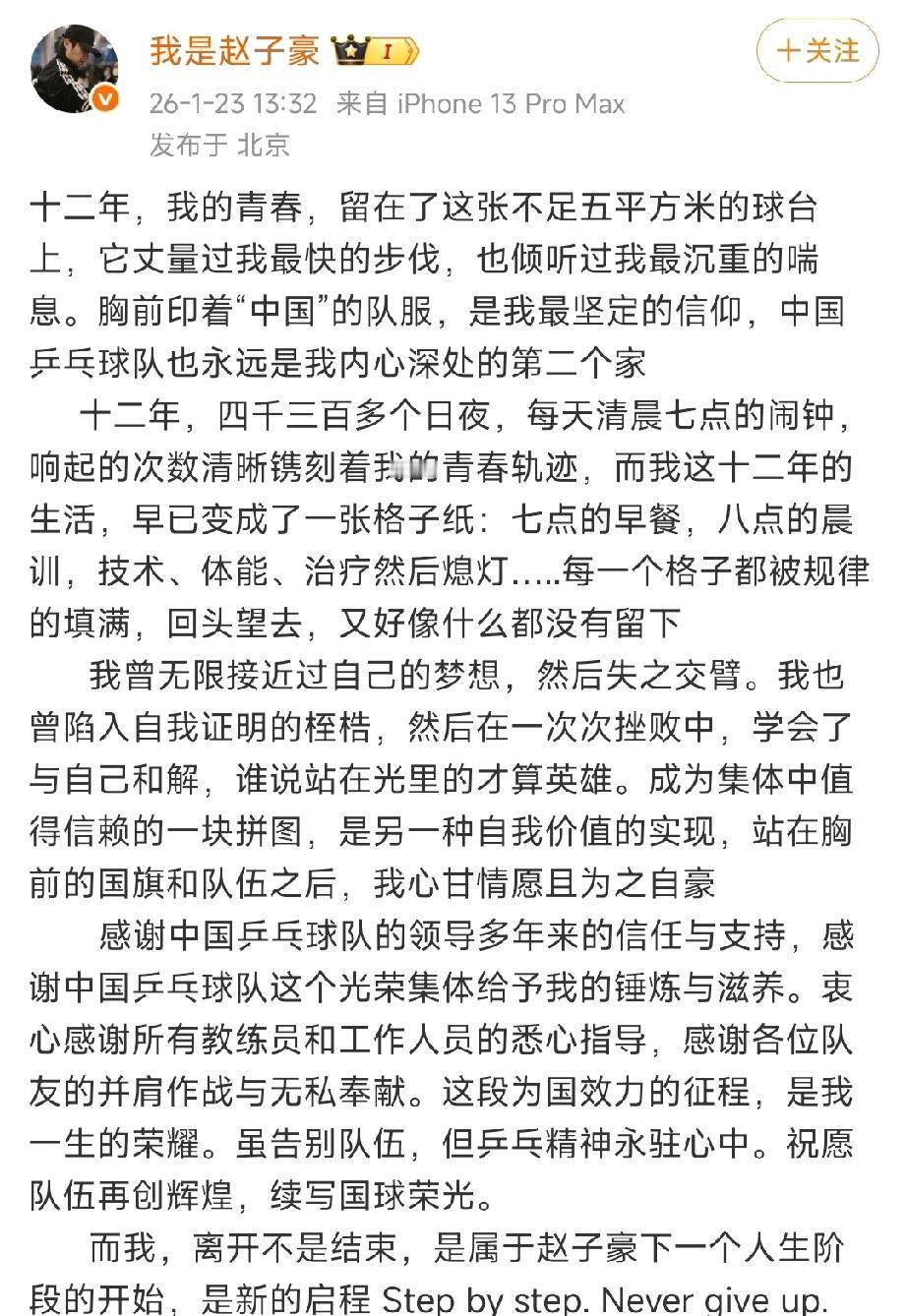 樊振东好友赵子豪官宣退出中国国家乒乓球队!国乒目前正处于洛杉矶奥运周期新老交替阶段。很多看队员在国乒教练组完成竞聘工作,开启新周期具体工作后官宣退出国家队。赵子豪也是继队友孙闻、梁俨苧官宣退队后的又一名国家队运动员官宣退队。 作为国家队少有的直板打法,赵子豪虽然较少机会出征国际比赛,但是为樊振东等国家队主力备战提供了不遗余力的帮助。 赵子豪目前已经进入了“优青计划”上海市青年骨干教练员培训班,待到培训结束会从事乒乓球教练职业。
