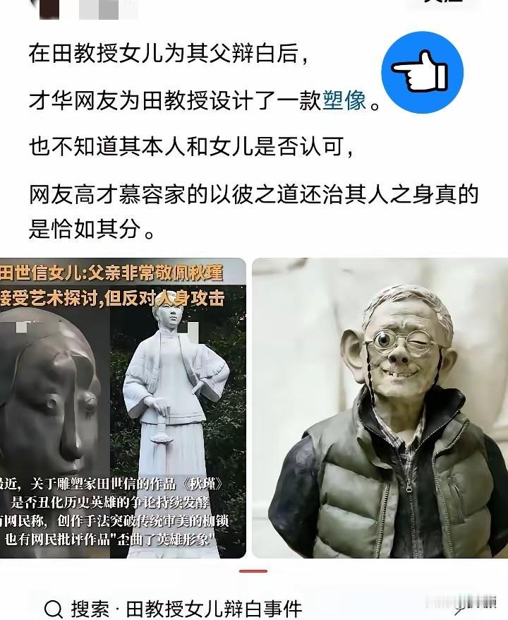田世信那雕塑本来就争议大, 结果他女儿非跳出来挡枪。 说什么是“艺术表达”,言外之意不就是咱大众没审美嘛! 这下网友可不买账了,直接以其人之道还治其人之身,给田世信设计了个同款画像,那神韵,简直“青出于蓝”。 我就纳闷了,要是这画像算冒犯,那当初那雕塑恶心大家眼睛的时候,咋就没人站出来说个不字呢?这双标玩得也太溜了吧!