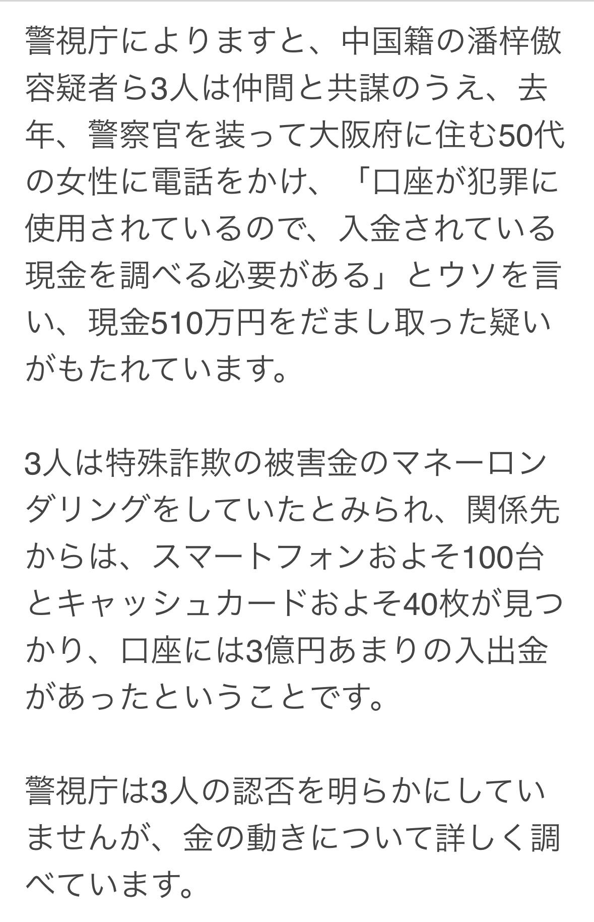 潘某等三人去年冒充警察,谎称大阪府在住50多岁女性的银行账号被盗用,要调查账户存款,骗走510万日元。 三人涉嫌洗钱,在相关人员处查获了约100部智能手机和40张银行卡,这些账户的存取款总额超过3亿日元。