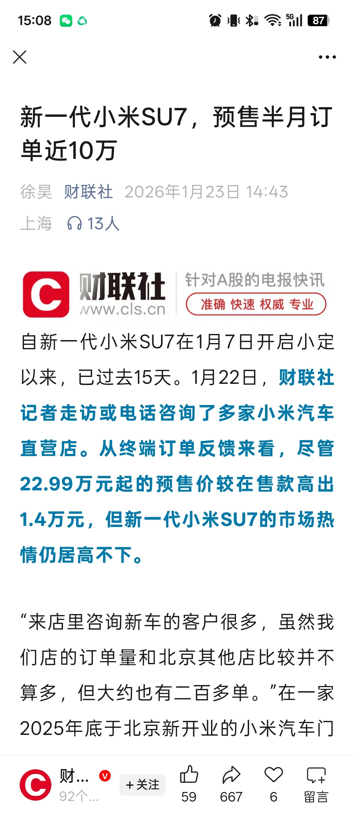 财联社消息,小米新SU7的预售小定近10万…不是说车市很冷嘛,什么情况?
