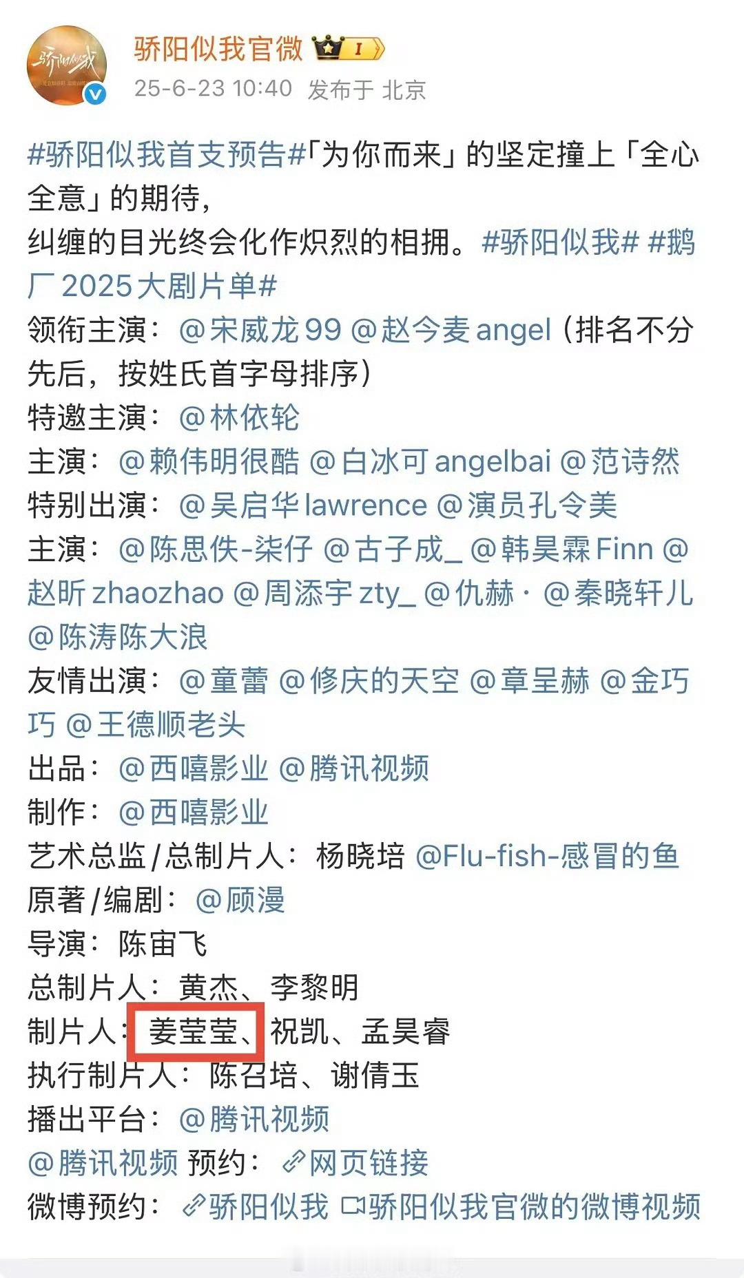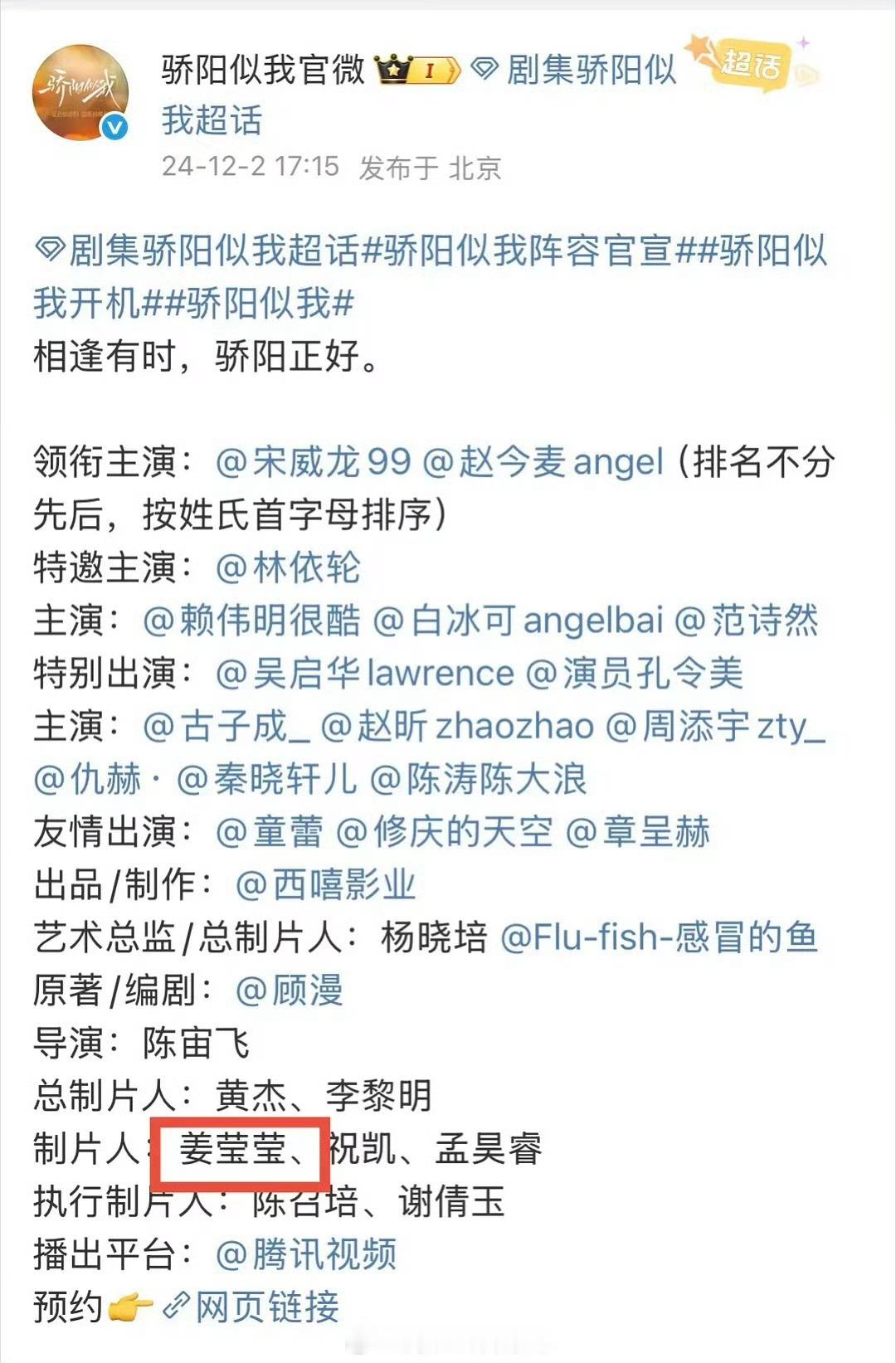 姜莹莹 杨晓培骄阳似我 姜莹莹制片人姜莹莹被移送公安机关 最新!!!腾讯视频制片人姜莹莹因利用职务便利谋取利益被移送处理。曾参与制片项目《焕羽》《骄阳似我》《六姊妹》《似锦》等,据悉,这些项目几乎都是和西嘻影业(总制片人杨晓培)公司合作的~此前,《骄阳似我》官博也快速将姜莹莹名字编辑删除👀