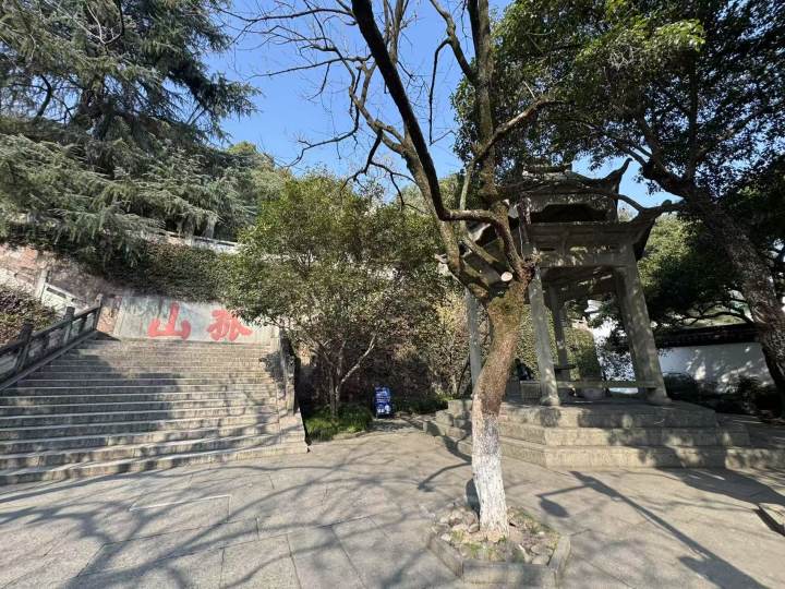 从中山公园的大门进去,看到石壁上的“孤山”大字别上山,从右边石亭后的小路走进去,就会看见这个藏在山脚庭院里的亭子。