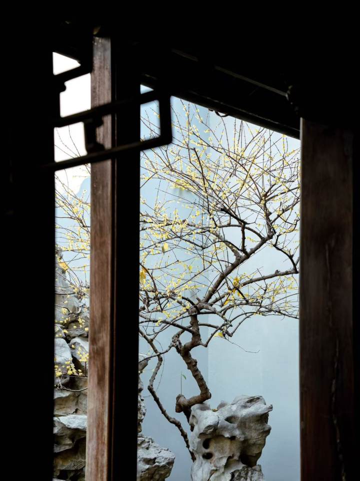 它就长在延碧堂后的天井里,假山边斜斜探出半树黄花。枝干弯弯曲曲的,特别有老底子中国画的味道。