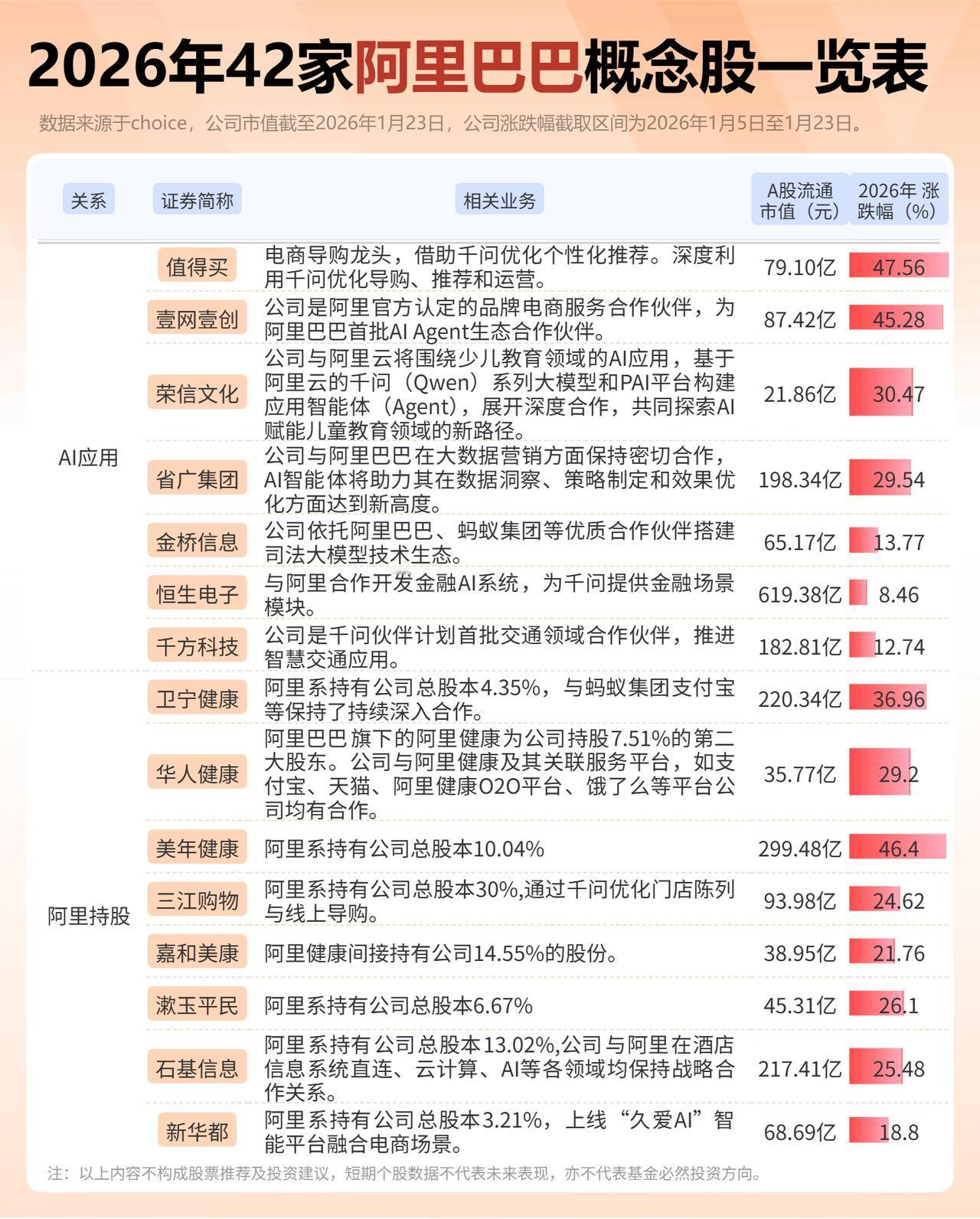42家阿里巴巴概念股一览表(附概念解析) (向右滑动图片查看完整名单) 阿里巴