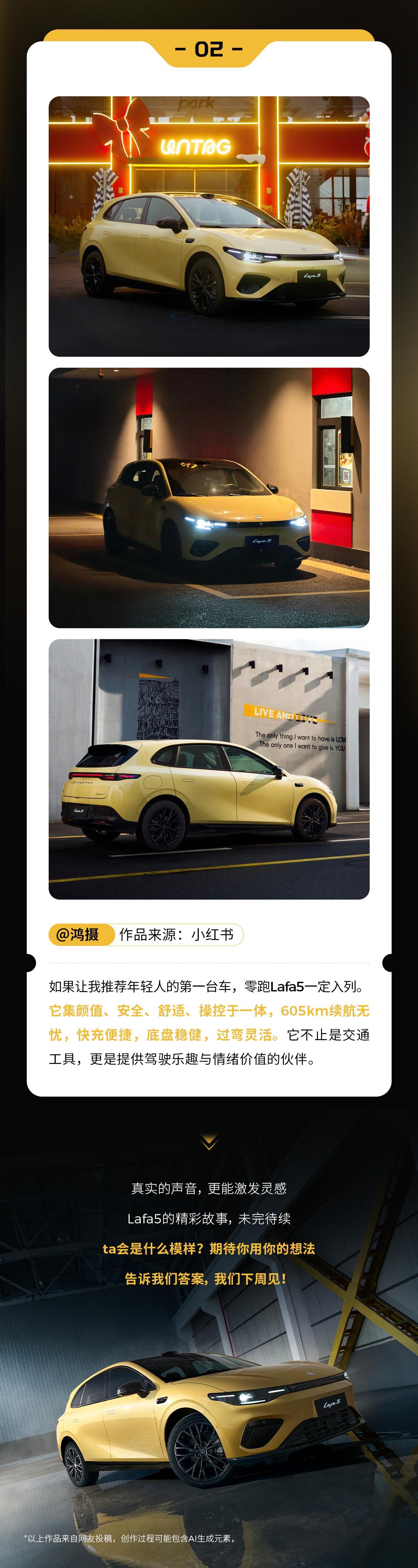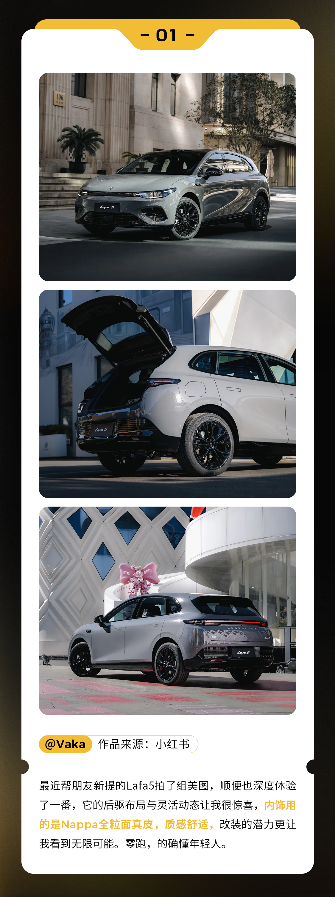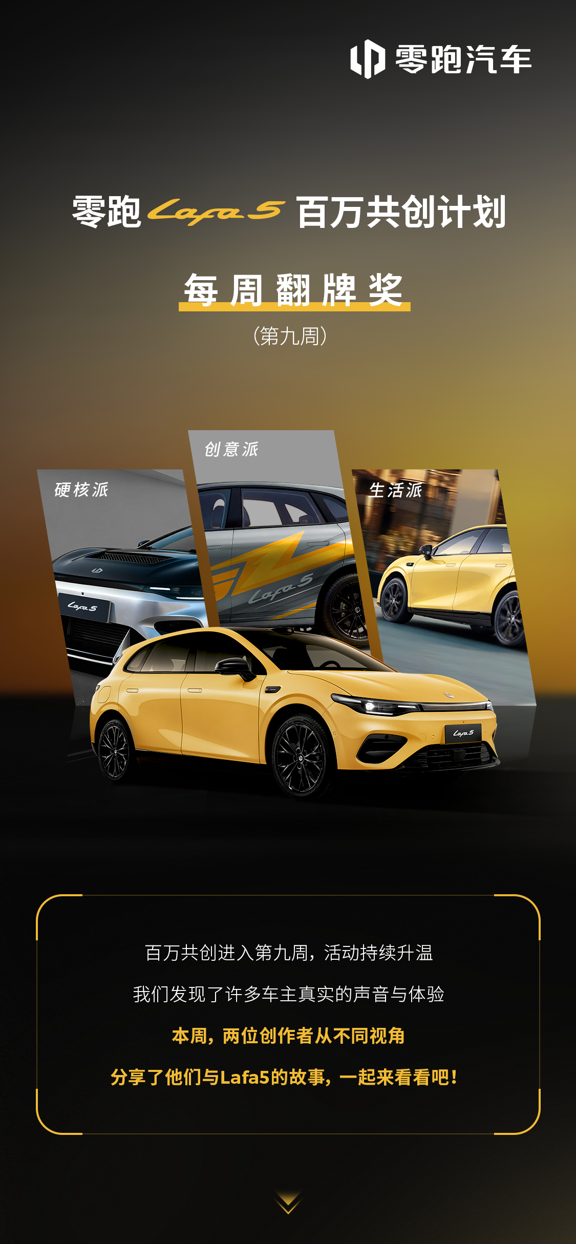 零跑Lafa5 百万共创计划丨第九周翻牌奖揭晓!恭喜本周两位创作者,各获得100元京东卡奖励!🎉🚗 探索,是驾控的灵魂。在Lafa5身上,看到了改装的无限可能📸 颜值、安全、乐趣兼备,Lafa5堪称年轻人第一台车的“答案”两位创作者,两种视角,一样的热爱❤️🎁你也想被翻牌?⏰时间:即日起-2026年3月31日📍平台:零跑APP/微博/小红书/抖音等📌带话题:每个人都可以有自己的Lafa零跑Lafa5 发布你的原创内容🔧硬核派/生活派/创意派,三大赛道开放中,百万共创支持金持续助力!真实体验,真实声音,Lafa5的故事,因你而生动✨👇快来分享你与Lafa5的独特故事,下周再见!