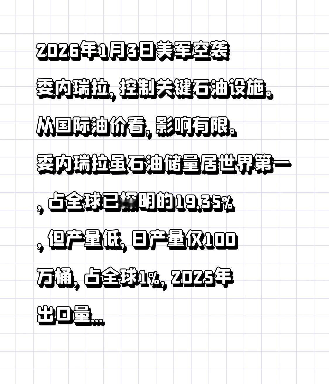 2026年1月3日美军空袭委内瑞拉,控制关键石油设施。从国际油价看,影响有限。委内瑞拉虽石油储量居世界第一,占全球已探明的19.35%,但产量低,日产量仅100万桶,占全球1%,2025年出口量也只占世界海运贸易量2%,且正值OPEC+扩产季,缺口会被补齐。 从油运市场看,短期VLCC等大型油船或受益,美湾炼油厂找新货源会拉升航运距离;承担加勒比海油运的中小型油船与影子船队不利。中长期,若美扩大委出口,短途原油运输和成品油出口会利好。美国强行控制变现委石油,给全球市场带来不确定性。