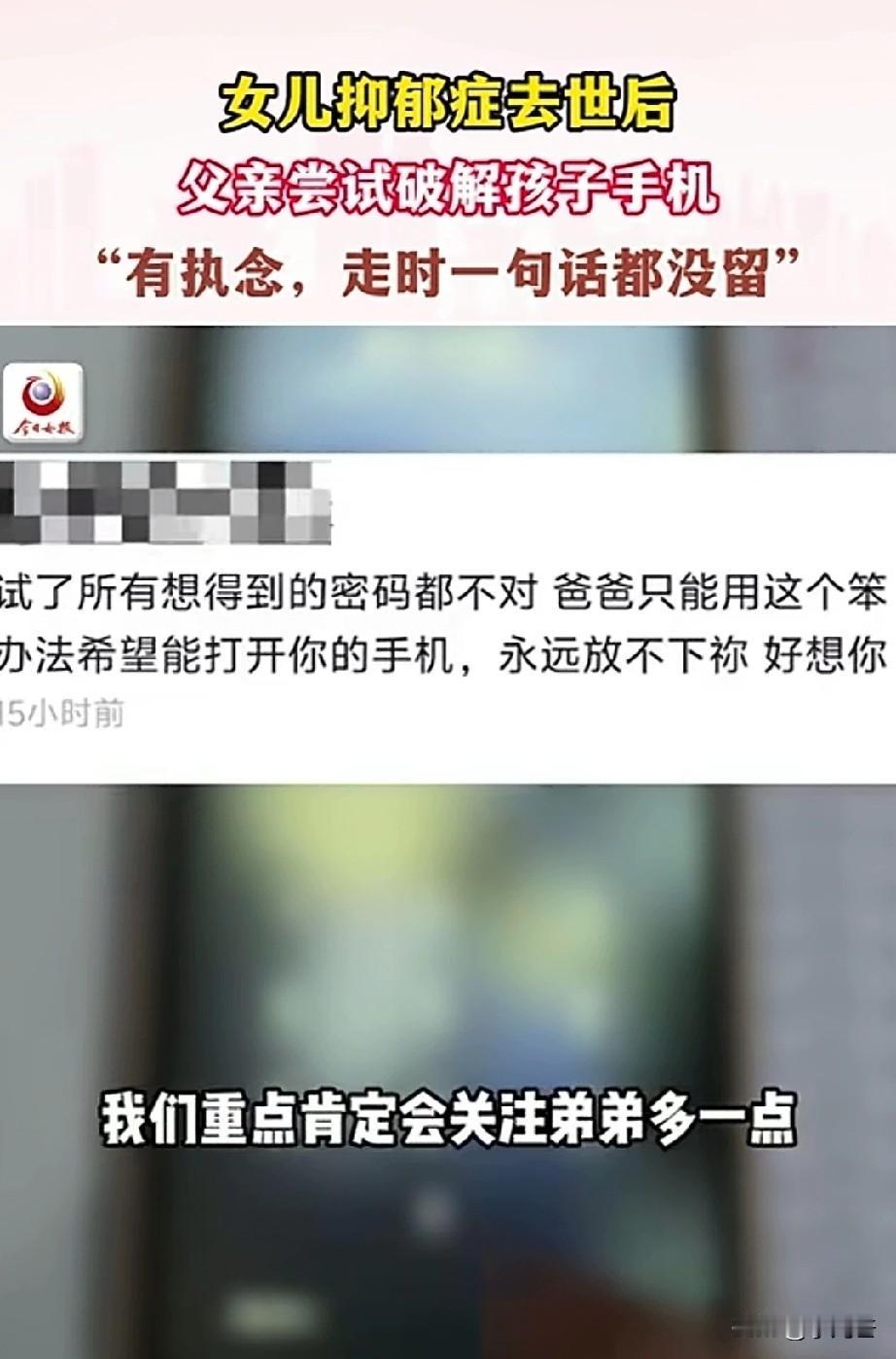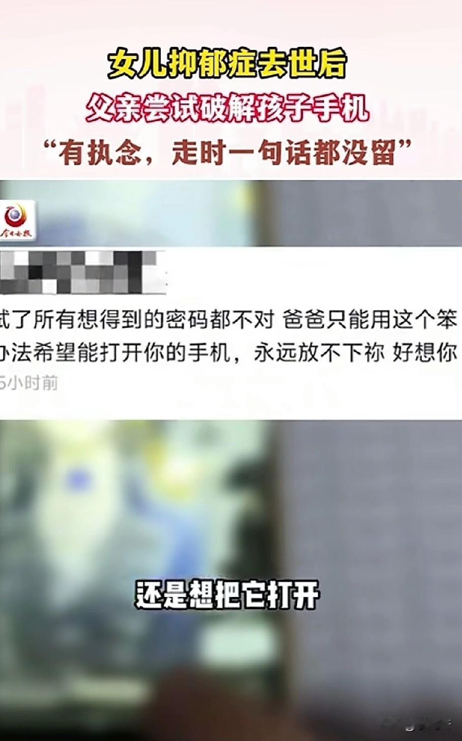“这执念一辈子难过去!”一位父亲发视频,自己干餐饮起早贪黑,还生了二胎弟弟,却不知女儿患有抑郁症和双相情感障碍,以为是普通小孩子的厌学情绪,给女儿办理了休学都没重视。直到女儿抑郁症去世,一句话没留,父亲悔不当初,女儿青春期的自卑无人察觉,父亲绞尽脑汁试了各种密码都打不开手机,最后只能按照数字排序列表,一个个试密码! 男子说一开始以为是小孩子不想上学找借口,也给女儿办了休学。夫妻每天起早谈很,根本没有时间关心女儿,去医院后医生诊断是双相情感障碍。 夫妻来不懂抑郁症,没有引起足够的重视。如今回想起来,女儿是有些变化,进入生长发育期,有些胖,会在同学面前自卑。 可能也觉得父母有些偏心,生了二胎之后,精力都放在弟弟身上,忽略了女儿的感受。 父亲不甘心,女儿一句话没留,什么交代没有,这成了他的执念。于是找到女儿的手机尝试解锁,手机解开了也就知道了女儿的秘密。 于是他把家人所有的密码都试了,还找了技术部门,甚至女儿喜欢的偶像有关的密码都试了还是没成功。 最终崩溃的他用数字排序的方式,四个数字组合,列出来万组数字,一个个试,试到手机被锁,也不愿意放弃。 有人说看父亲一个个试密码,就知道平常和女儿缺乏沟通。 或许大人都低估了孩子的思想,但是确实接受不了,一句话没说,什么都没留就走了,哪怕她埋怨爸妈,和父母吵一架也好受些!