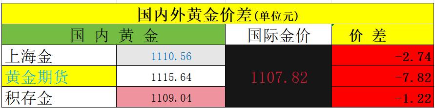 周五 黄金再创新高,国内外齐刷刷上涨。 国内上海金收盘于1110.56元, 黄金主力收盘于1115.64元, 民生积存金1109.04元。 国际金价4935.3美元/盎司, 简单折算成人民币就是1107.82元。 我们知道国内外黄金是 有一定价差的。 通过下面的数据,可以明显看出: 黄金期货最强, 上海金次之, 国际金价最弱。