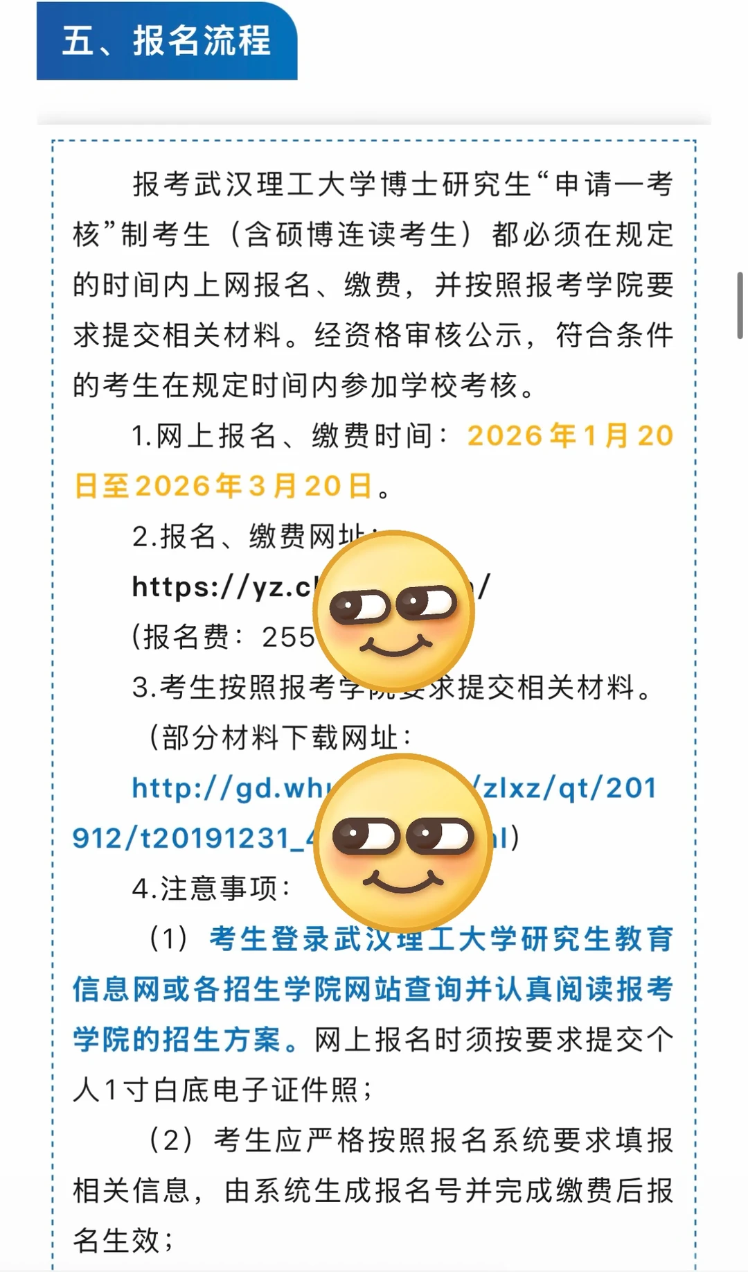 报考武汉理工大学博士研究生“申请—考核”制考生(含硕博连读考生)都必须在规定的时间内上网报名、缴费,并按照报考学院要求提交相关材料。经资格审核公示,符合条件的考生在规定时间内参加学校考核。1.网上报名、缴费时间:2026年1月20日至2026年3月20日。 各招生学院拟招生人数见招生目录。2025年学校共计招生1056人,2026年招生人数以教育部下达我校的实际招生计划数为准