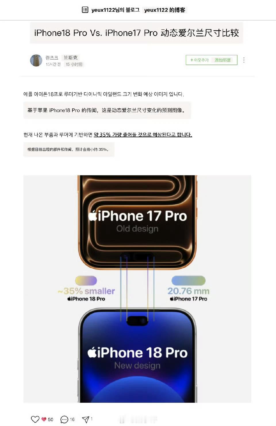 iPhone18Pro和前代对比图传来传去,iPhone 18 Pro还是有可能用更小的灵动岛屏幕,不会用左上角打孔屏,18 Pro灵动岛面积只有17 Pro的三分之二,屏占比更高了!按照目前进度,以后还是用小点的挖孔和屏下Face ID
