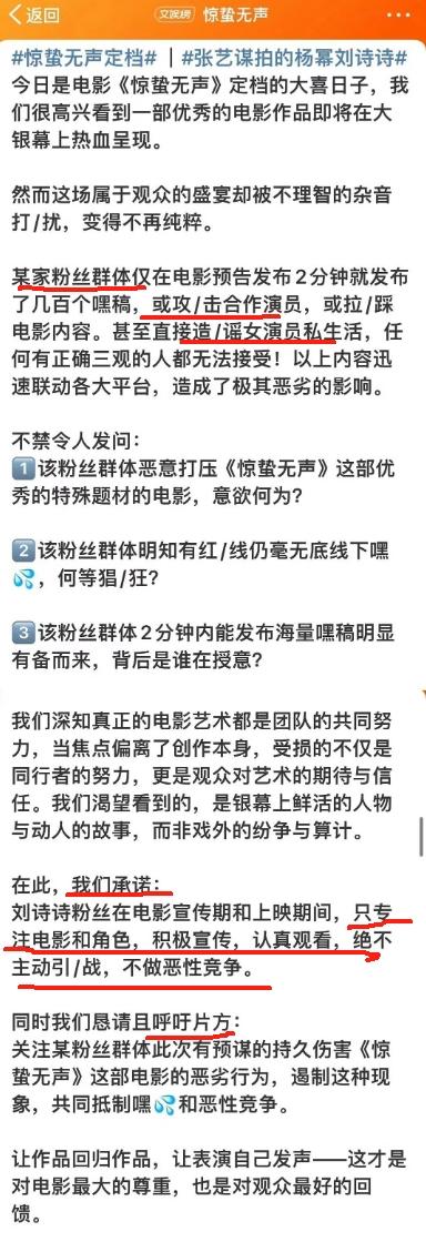 杨幂刘诗诗粉丝吵起来了! 《惊蛰无声》发布了海报和预告片,两家因为几秒的镜头吵起来了,两家都说片花发布没几分钟,自己被对方买了上百个黑热搜,已经吵到明面上了,其实她俩都只能借此机会在张艺谋的影片里刷刷脸,和张艺谋合作本身就是很漂亮的履历,主要剧情应该都在男演员那边,一分钟预告,她俩一人一秒,没必要花精力吵架。