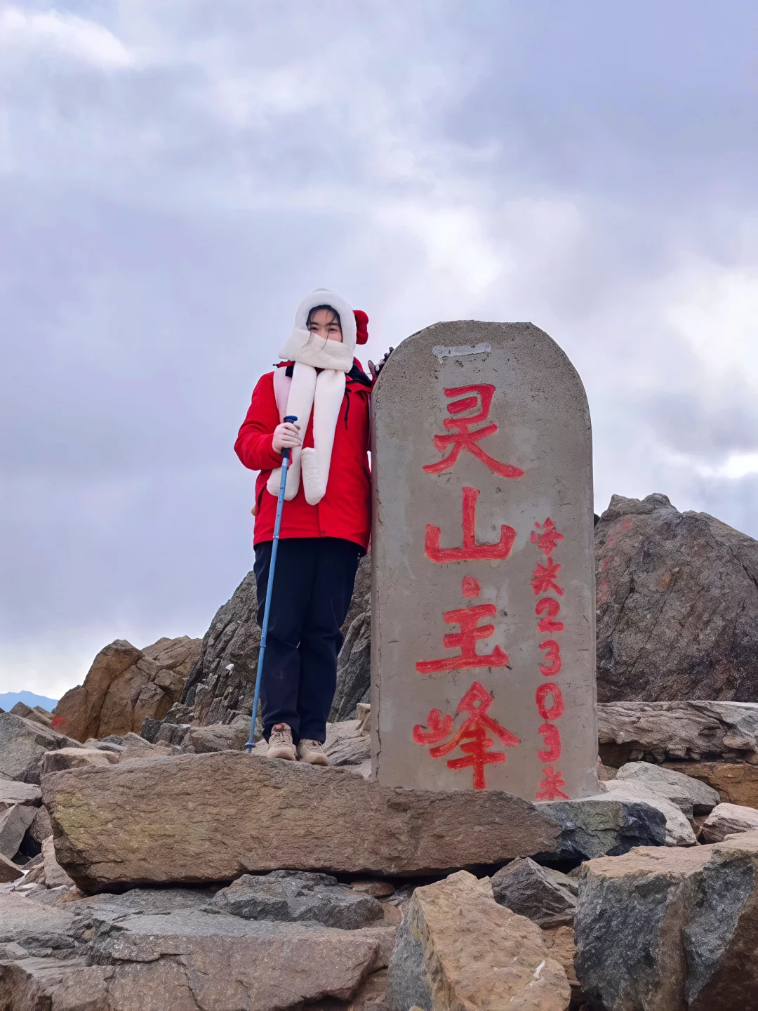 💡 海拔2303米的石碑旁必打卡!穿亮色外套拍照巨出片📸,我这件红色冲锋衣被路人问了三次链接~