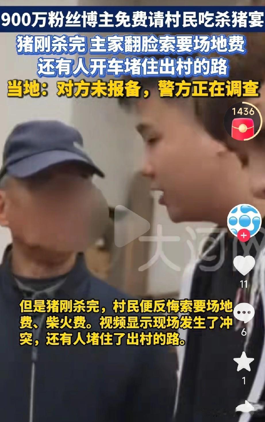 网红办杀猪宴后续,那个村的村长先委屈上了,他对媒体说,网红办杀猪宴,既没和他们村里报备,也没和街道报备。 他说这件事网红发的视频里根本没有独居老人,这和他们说的邀请独居老人吃饭不符。现在视频被传的沸沸扬扬,严重抹黑了他们村的形象,他们已经报警。 村长维护本村村民可以理解,可是你们村村民张口就要两千块这是事实吧,你能回应一下这是要的什么钱吗? 还有那个拿镰刀的,还有冲上来要打人的,他们又是什么人,和主家是什么关系。还有用车挡路不让人家走,又是什么意思吗?