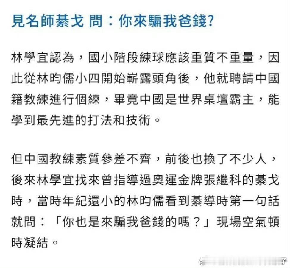林昀儒恩师綦戈教练21年的一段采访🎤谈林昀儒的培养与情绪管理。又想起他们俩第一次见面,小林的第一句话是:“你也是来骗我爸钱的吗?”🤣🤣🤣綦戈:2014年3月,为了继续恢复身体,毕竟年纪也在越来越大,便选择了病休。同年5月,我去台湾宜兰休养,休养之余,因好友柯维佳教练的认可与引荐,我开始教小林,也是一种缘分。客观说,无论教练员教过哪位优秀的队员,也是短暂的过程,不能从头抓到尾,比如最终要输送入国二、国一,难有真正的成就感。林昀儒是我从他13岁时一直带到大的,是真正自己培养出来的学生,所以感受很不一样……记者:2020年,林昀儒代表山东魏桥俱乐部参加了中国乒超联赛,并与队友协力配合最终获得亚军的好成绩。您作为陪伴他7年之久的教练,能否与我们讲述一下生活中的小林是一名怎样的运动员?綦戈:好的。我教林昀儒是从2014年5月开始,那时他13岁,发育比其他小孩可能晚两岁。特点是,手感球性好,落点意识强。其实,现在回想小林的成才,也是歪打正着。问:为什么这样说?綦戈:小林小时候练步法,打摆速,包括多球因体能较弱练不长,所以天天会练发、接球,教他拧拉,教他发高抛。而且每天练七八个小时,有时他父母看着我们练习,都睡着了,练到晚上近十一点,也很正常。所以,练就了他过人的接发球拧拉和高抛发球。除此之外,我觉得他能有今天,还有两个方面:自己特喜欢乒乓球,没事就看乒乓球的视频,就像一个爱好者一样着迷,兴趣是最好的老师。其二,他有超长的自控能力,特别是对情绪的把握,比一般的小孩儿要好得多,自我管理能力比较强,所以他在大赛当中很冷静。而且,能够每临大事,有静气,好多年轻的队员,甚至是大队员,在遇到大赛时往往吃不好,睡不着,但他在这些方面,有超长的本领,能够遇事不慌。记者:难能可贵。綦戈:是的。当然,这与他的家庭也有关系,他爸爸也经常教导他,再就是他从三年级开始,就是自己请私人教练教学,没有去体校学习乒乓球。所以一直到今年他20岁,基本上都以家庭为主,他的整个青春期也都在父母的呵护下成长,所以心理健康。小林这种队员,家教比较好,爸爸是大学老师,妈妈是中学校长,属于书香门第之家,一家人知书达理,不会让教练为难,即使有分歧,他们也不会让别人难堪,情商很高。记者:由此可见,小林父母的情商与素质确实很高。綦戈:小林经常钻研乒乓球技术和战术,所以我虽然现在只抓训练,但是比赛前根据对手的情况,也会给他布置战术、准备,比赛结束后我会给他做赛后小结,现在网络发达,通讯也方便。