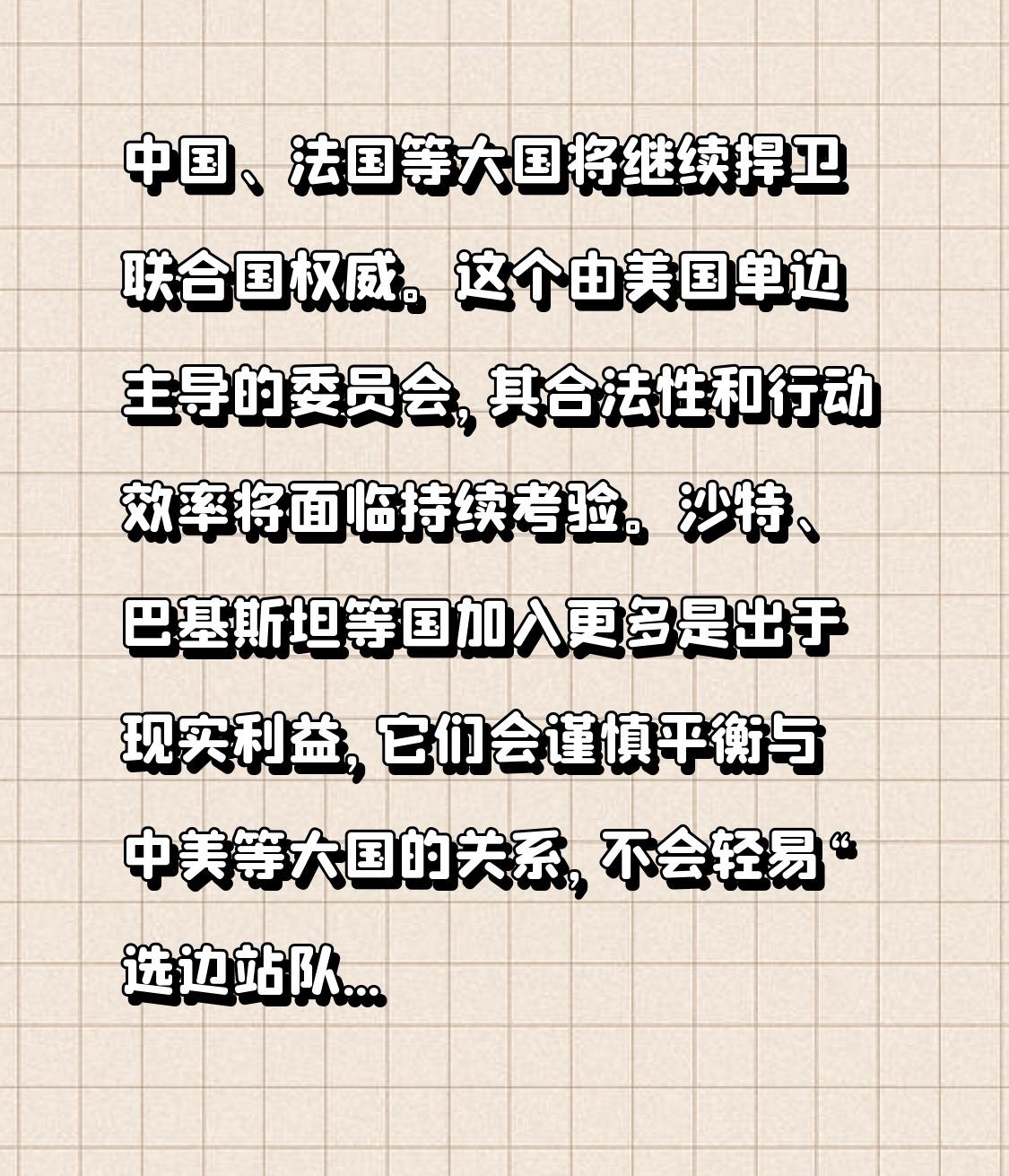 中国、法国等大国将继续捍卫联合国权威。这个由美国单边主导的委员会,其合法性和行动效率将面临持续考验。沙特、巴基斯坦等国加入更多是出于现实利益,它们会谨慎平衡与中美等大国的关系,不会轻易“选边站队”