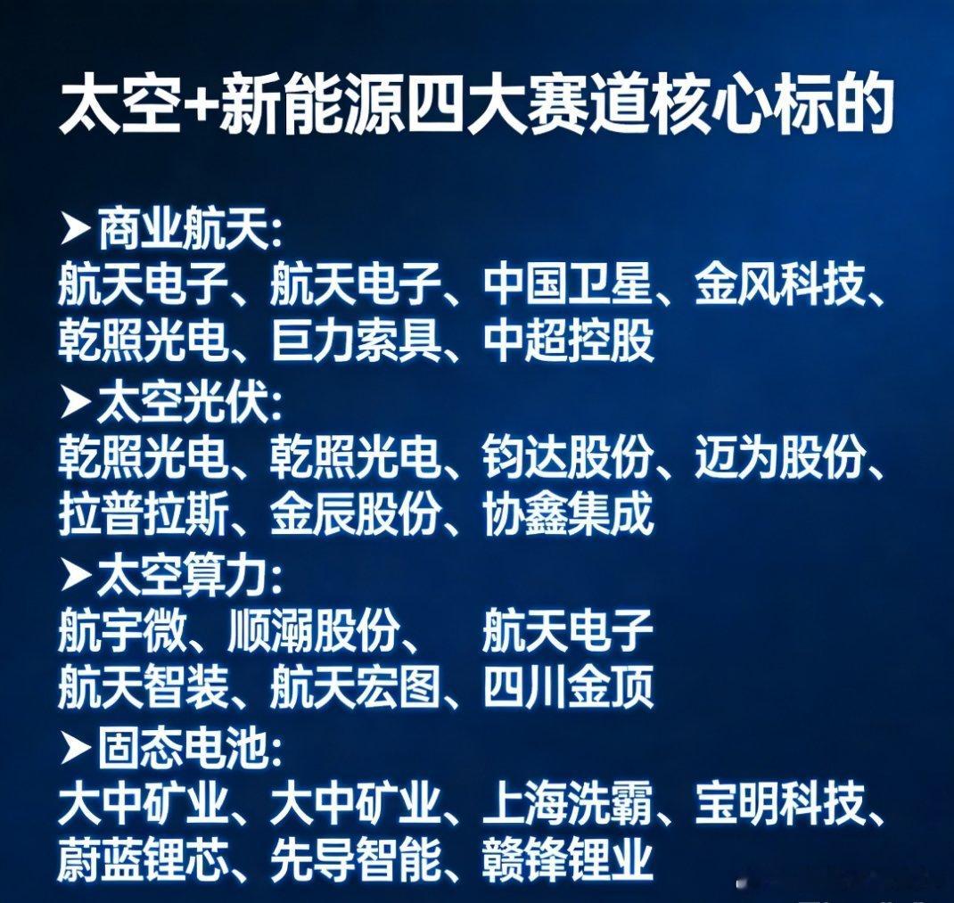 太空+新能源四大赛道核心标的▫️商业航天:航天电子、中国卫星、金风科技、乾照光电、巨力索具、中超控股▫️太空光伏:乾照光电、钧达股份、迈为股份、拉普拉斯、金辰股份、协鑫集成▫️太空算力:航宇微、顺灏股份、航天电子、航天智装、航天宏图、四川金顶▫️固态电池:大中矿业、上海洗霸、宝明科技、蔚蓝锂芯、先导智能、赣锋锂业