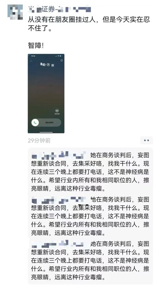 近日,一则来自某券商员工的朋友圈内容在金融圈内迅速传播,引发广泛关注。该员工罕见地公开点名批评一位来自头部数据公司的女性负责人,言辞激烈,直指其行为“智障”“神经病”,甚至称其为“行业毒瘤”。这一举动打破了业内通常保持的克制与体面,迅速激起热议。