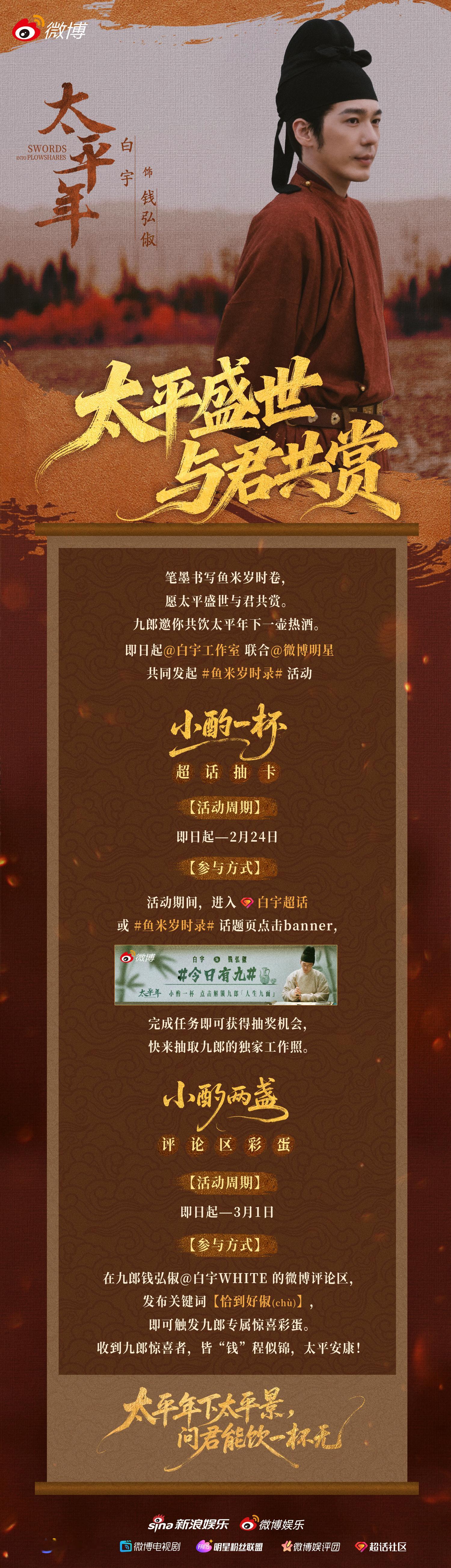 白宇 快来参加联合 发起的鱼米岁时录 话题活动,还有今日有九 惊喜小卡掉落!不仅能抽到九郎工作照,还可以触发评论区彩蛋,这剧播期太幸福了,粉丝们快来集卡查收小惊喜!