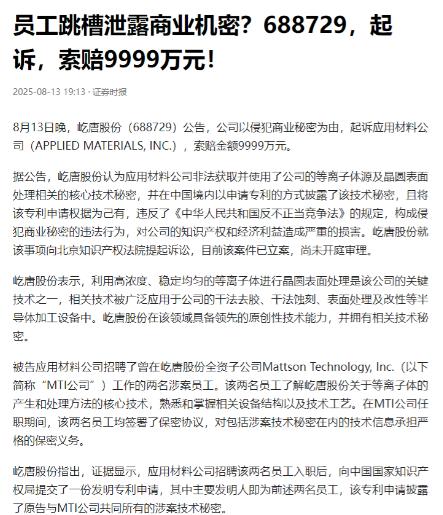 又出2名内鬼,损失巨大! 这就叫“日防夜防,家贼难防”。 在国产半导体被外部势力层层封锁、举步维艰的今天,最让人寒心的不是对手在技术上的硬碰硬,而是自己人从背后捅的这一刀。 就在大家都在为突破技术壁垒咬牙坚持的时候,北京屹唐半导体发生了一件让整个行业都脊背发凉的事:两名核心研发人员,竟然把公司辛苦搞出来的核心技术连锅端走,转手就给了竞争对手。这事儿不光恶劣,简直离谱到了极点。 先说说屹唐半导体是家啥公司,它可不是小作坊,是咱们国产半导体设备领域的龙头企业。成立于2015年,主要做芯片制造必需的晶圆加工设备,像干法去胶设备、快速热处理设备这些,都是它的强项。 2023年的时候,它的干法去胶设备全球市场份额排第二,快速热处理设备也排全球第二,能和三星、台积电这些国际大厂做供应商,在国内半导体行业里,算是能扛事的骨干力量。 咱们都知道,现在美国对中国半导体行业卡得有多严。2026年初又升级了管制,不光加征25%的关税,还限制先进芯片、设备和核心设计工具出口,连14纳米以下制程的EDA工具都禁售了。 国内企业想搞研发,只能靠自己一点点摸索,每一项核心技术都耗了大量的钱和时间,都是实打实的“家底”。屹唐半导体也不例外,2018年到2025年前三季度,研发费用率一直维持在15%左右,累计申请了721项发明专利,这些技术都是靠着日复一日的投入才攒下来的。 这次出问题的两名内鬼,之前都在屹唐的全资美国子公司MTI工作。MTI是屹唐2016年并购的,手里握着不少半导体设备的核心技术,这两名员工就是掌握关键技术的核心研发人员。 他们在入职的时候,都签了严格的保密协议,明确说了不能泄露公司的技术秘密。可没想到,他们跳槽去了美国应用材料公司之后,直接把屹唐的核心技术卖了。 这个美国应用材料公司可不是一般角色,是全球最大的半导体制造设备供应商,也是屹唐在市场上的主要竞争对手。 这两名员工入职应用材料后,就帮着新公司向中国国家知识产权局提交了一项发明专利申请,而这项专利的核心内容,就是他们从屹唐带出来的等离子体源及晶圆表面处理技术。 这种技术是半导体加工的关键,能用到干法去胶、干法蚀刻等设备上,直接关系到芯片的质量和生产效率,是屹唐多年研发的核心成果。 更过分的是,应用材料不光想把这项技术变成自己的专利,还涉嫌用这项偷来的技术生产产品,在中国市场推广销售。这一下对屹唐的伤害可太大了,不光自己的技术成果被别人抢了,还多了一个用自己技术和自己竞争的对手,前期所有的研发投入都面临打水漂的风险。 察觉到情况后,屹唐立马采取了行动,向北京知识产权法院提起了诉讼,要求应用材料停止使用、披露这项技术,销毁相关资料和侵权产品,把专利申请权归还,还索赔9999万元。 这笔赔偿金额不是随便定的,里面包含了实际经济损失和三倍的惩罚性赔偿,可见这事对屹唐造成的冲击有多大。目前案件已经被法院受理,但还没开庭审理,最终结果还得等法院判决。 有人可能觉得,不就是一项技术吗?损失点钱再研发就行了。可懂行的都知道,在半导体行业,技术就是生命线,尤其是在外部封锁的大环境下,每一项核心技术都来之不易。 屹唐花了好几年时间,投入上亿资金才搞出来的技术,被内鬼一句话、一份资料就泄露给了竞争对手,不仅要面临市场份额被挤压的风险,后续再想研发新技术,难度和成本都会大大增加。 而且这事儿不是只影响屹唐一家,对整个国产半导体行业都是个警示。现在国内企业都在齐心协力突破技术封锁,大家各自在不同领域发力,好不容易攒下点家底。 内鬼的这种行为,相当于在团队内部捅了个窟窿,不仅打击了企业研发的积极性,还可能让竞争对手摸清我们的技术底线,给整个行业的突围添了大麻烦。 其实企业也不是没做防备,入职签保密协议是基本操作,可就像屹唐董秘办的人说的,要是员工真想做坏事,签了协议也拦不住。 这也暴露了企业在技术保密管理上的漏洞,核心技术的管控、员工的职业道德教育,都还得再加强。毕竟在外部压力已经够大的情况下,内部再出问题,后果真的不堪设想。 现在国产半导体行业走得有多难,只有业内人最清楚。美国的管制层层加码,先进设备买不到,核心技术被卡脖子,企业只能靠自己硬闯。在这种时候,最需要的就是内部团结,每个人都守住自己的底线,把心思放在研发和突破上,而不是为了个人利益,出卖公司、出卖整个行业的未来。 这次屹唐起诉应用材料,也是在给所有企业和从业者提个醒:核心技术绝不能丢,内鬼绝不能纵容。 不管最终判决结果如何,都希望能给行业敲响警钟,让大家都重视起技术保密,别让辛苦换来的研发成果,毁在自己人手里。只有守住内部防线,才能在外部封锁的困境中,慢慢闯出一条属于国产半导体的路。