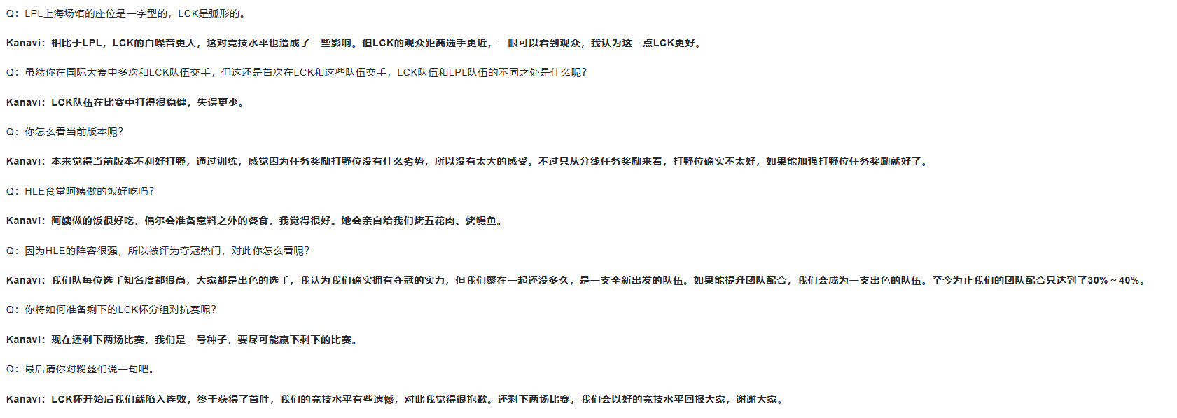 Kanavi说HLE有夺冠实力Q:因为HLE的阵容很强,所以被评为夺冠热门,对此