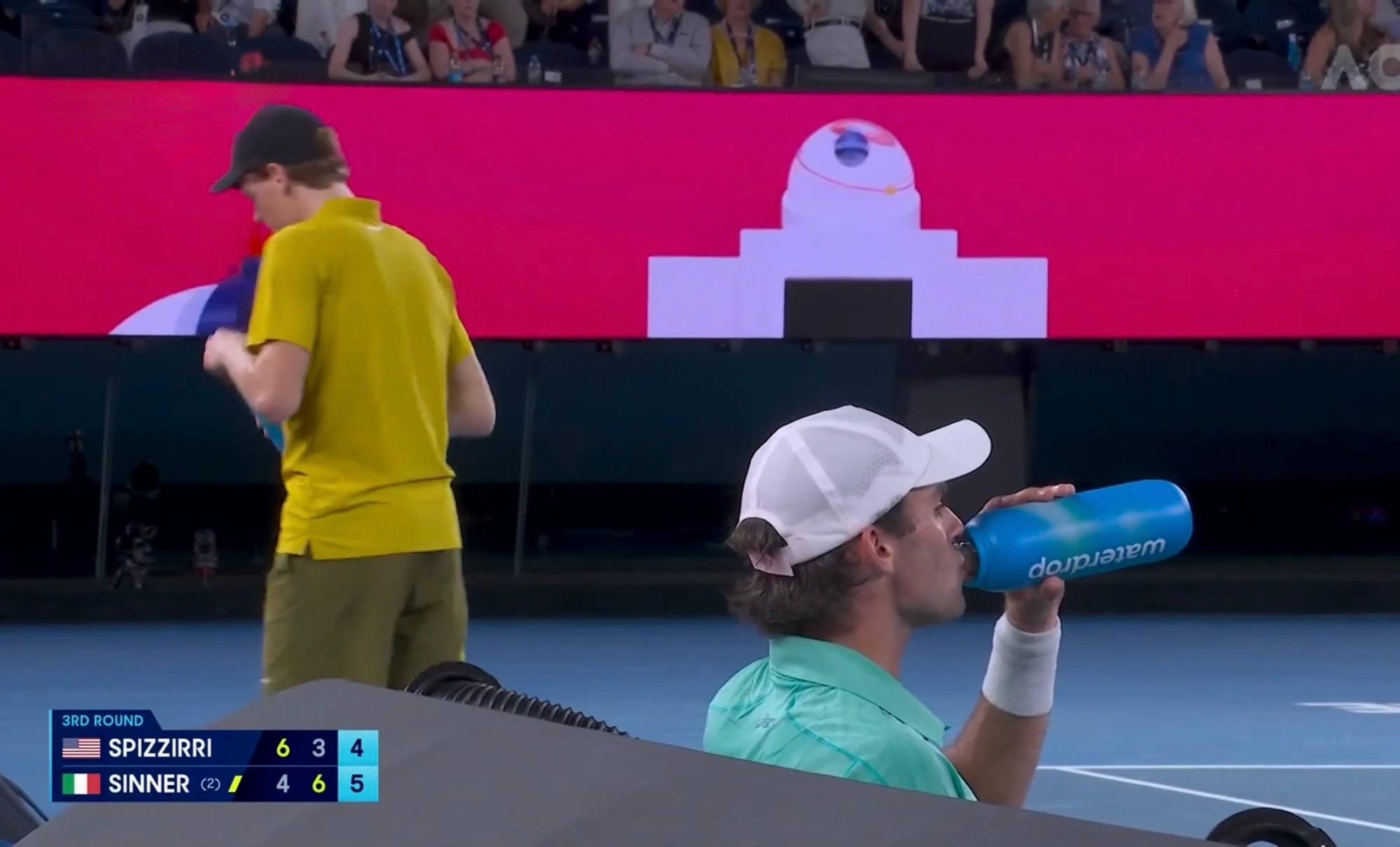 辛纳vs斯皮泽里 关完顶棚恢复比赛后,辛纳两度破发从1-3落后到6-4反超,大比分2-1领先斯皮泽里。辛纳抽筋澳网2026