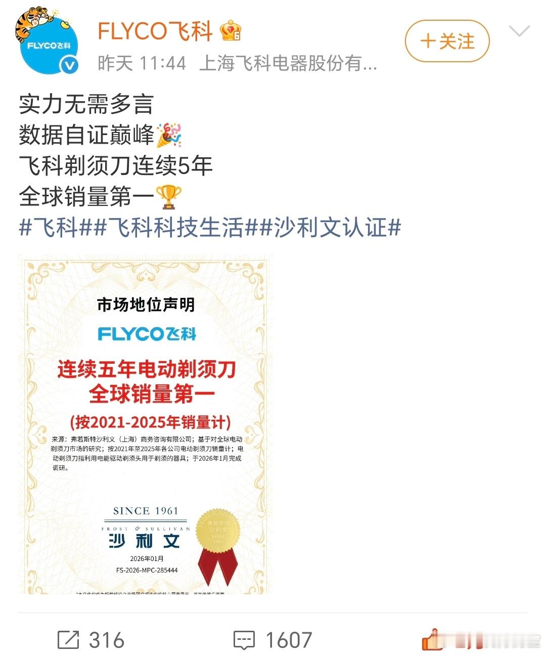 飞科(FLYCO),上海飞科电器股份有限公司旗下品牌,1999年创立,2016年4月18日于上交所上市,是中国A股首家个人护理电器上市企业 。 公司以研发创新与品牌运营为核心,主营电动剃须刀、电吹风等个人护理及生活电器,总部在上海,生产基地布局浙江、安徽 。其电动剃须刀多年蝉联全国销量与占有率第一,拥有近800项专利,是小家电多项国标起草单位,产品远销30多国 。