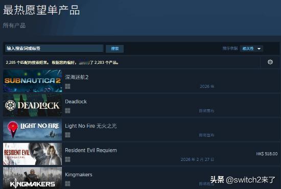 《生化危机9:安魂曲》将于2月27日登陆任天堂Switch 2、PC、PS5与Xbox Series X平台。 截至目前,游戏现已在美国、英国等13个国家和地区的PlayStation商店中位列预购榜第一名,玩家们对此期待满满。 此外,《生化危机9:安魂曲》在Steam愿望单中位列第4位。