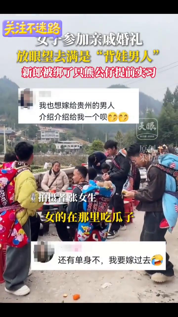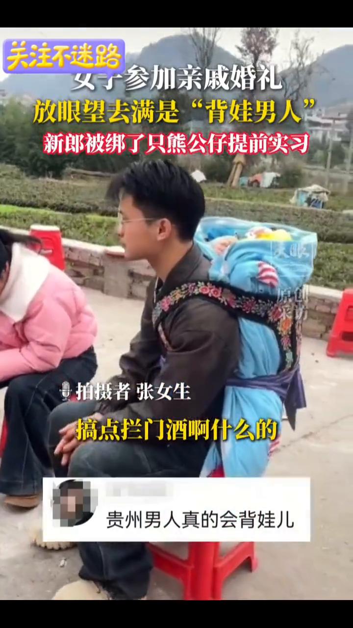 女子参加亲戚婚礼,放眼望去满是"背娃男人",新郎被绑了只熊公仔提前实习。 拍摄者张女生。 1月23日,贵州黔东南。今天堂妹结婚,基本上都是男人背娃,女的在那里吃瓜子,搞点拦门酒什么的,让新郎提前适应一下。以后带娃、背娃、给娃穿衣服什么的,去街上能看到男人背孩子的很多。