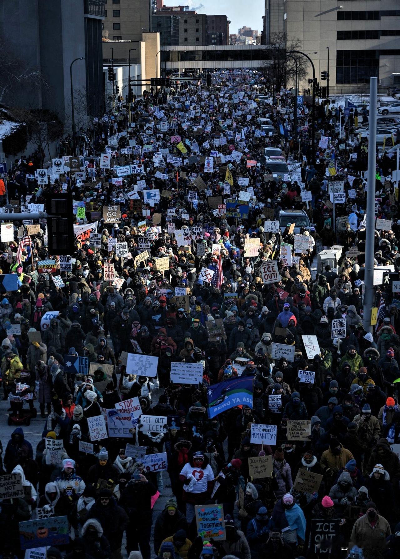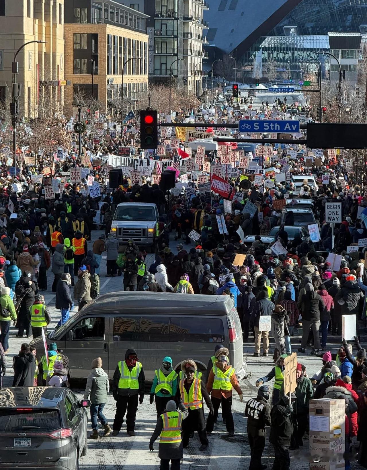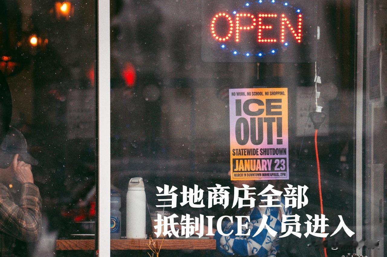 民智突然苏醒?——气温零下23摄氏度的明尼阿波利斯市中心,人山人海。 美国人聚集在这里参加反对美国移民及海关执法局(ICE)的集会,人群还在不断增加中。在这种气温下,你甚至很难用金钱买到人帮忙“代排队”。 当地商店无论大小今天要么关闭,要么宣布禁止ICE人员进入消费——目的是让他们买不到热咖啡和电暖手宝。