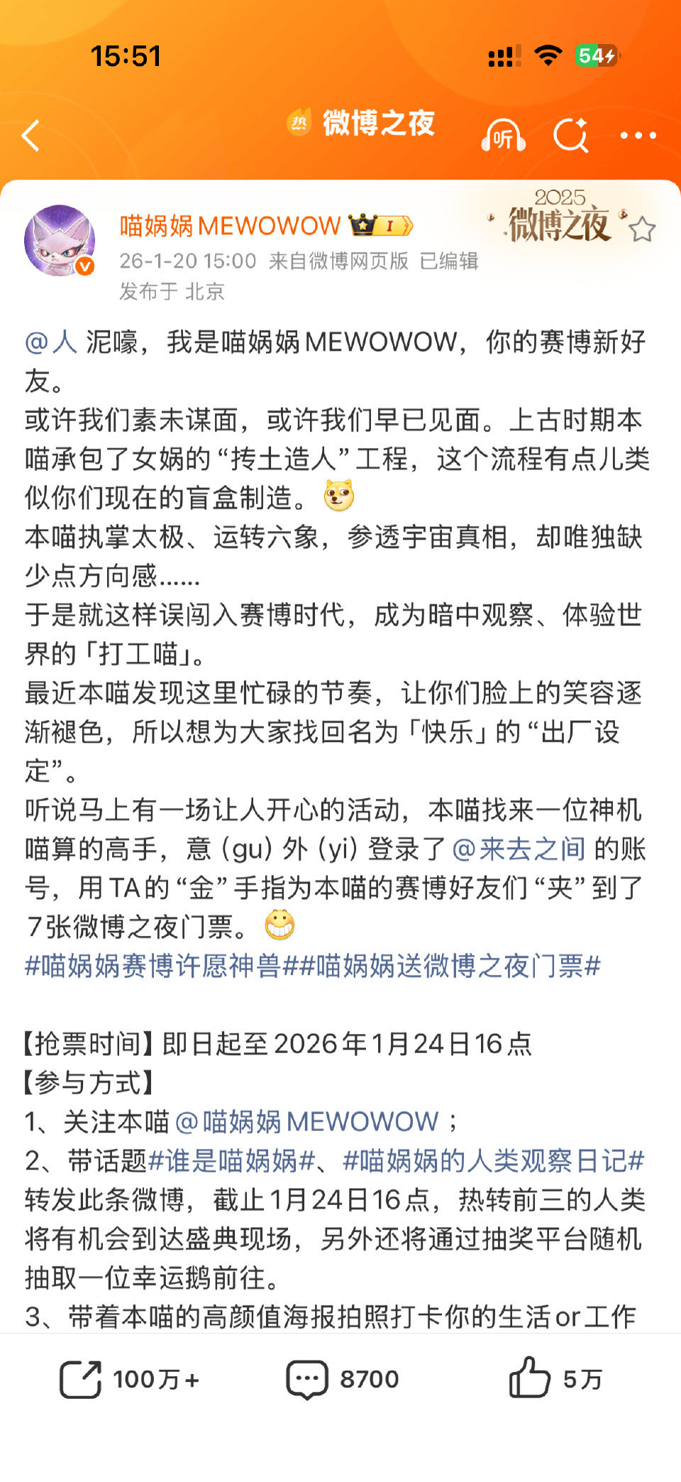 喵娲娲连送五天微博之夜门票 谁还没蹲到微博之夜门票?看这里!连续五天派送门票福利,赛博许愿池可不是浪得虚名!跟着TA的最新动态走,喊上你的追星搭子,一起解锁盛典入场券!