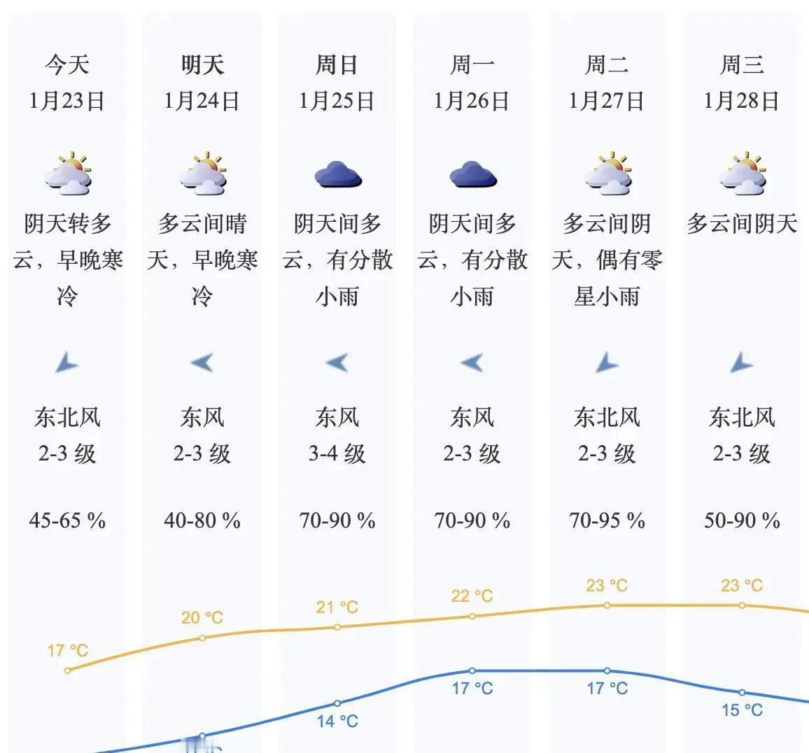 深圳昨天冷得让人直打哆嗦,全市九成多地方最低气温跌破10℃,体感特别刺骨,大家都裹得严严实实出门。 好消息来了,这股寒意终于要撤退!今天开始阳光慢慢露脸,白天最高气温能爬到17℃左右,虽然早晚还凉飕飕的,但回暖趋势已经很明显。出门多披件外套,白天就能感受到暖意扑面。 从明天起,天气彻底翻篇,寒冷正式拜拜,气温一天比一天高。不过风向转成东南,空气湿度跟着上来,本来盼着的干爽晴暖,估计会变成有点闷热的暖湿天。接下来几天云多起来,25日到28日还会断断续续飘小雨,干燥天气总算能缓口气。 全省范围广东其他地方也跟着松口气,23日到24日阳光增多,白天明显升温,但粤北高海拔山区早晚还有冰冻风险。25日起东风带水汽,全省大部转阴有小雨,早晚容易起雾。 全国层面,今年头一场寒潮已经收尾,中东部降水暂时消停,南方升温特别猛,江南不少地方几天内能涨10-15℃,像长沙从零下直接冲到近20℃,暖得飞起。但别放松警惕,25-27日和29-31日还有两股冷空气排队来袭,中东部又要雨雪加降温,贵州湖南等地可能再出冻雨。 这波回暖来得及时,大家赶紧抓住机会晒晒太阳、晾晾被子,但昼夜温差大,早晚别贪凉少穿。森林火险警报还在,干燥时段用火用电千万小心,野外火源坚决杜绝。天气反复无常,衣服别收太早,随时加减才靠谱