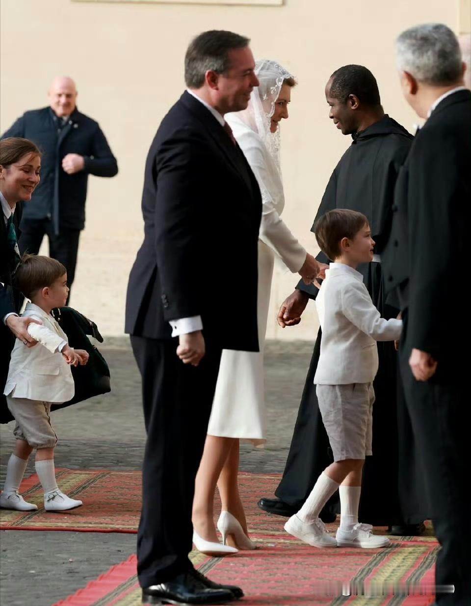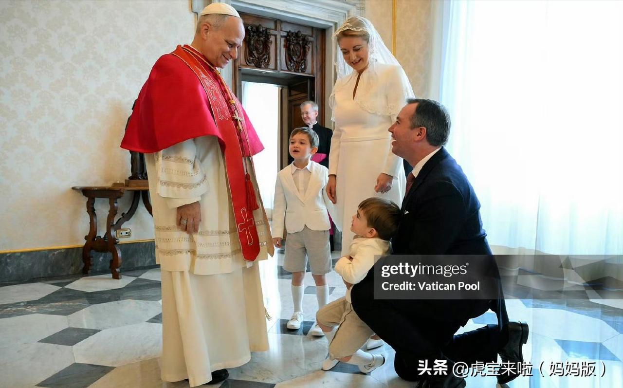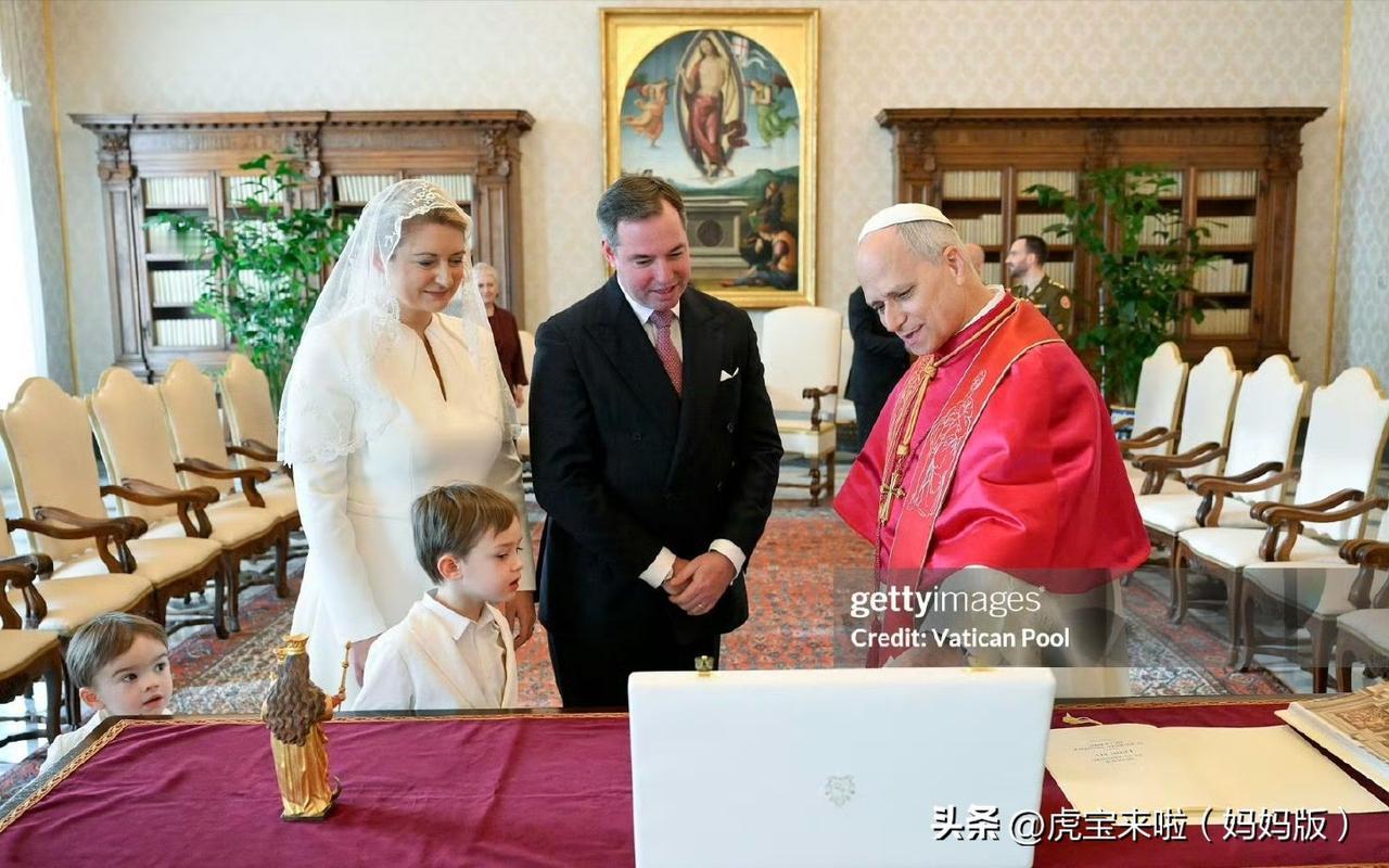 大公夫妇觐见教皇,斯蒂芬妮的白色套装,更显胖,夫妻俩倒是越来越像了!也终于见到了两个萌娃!