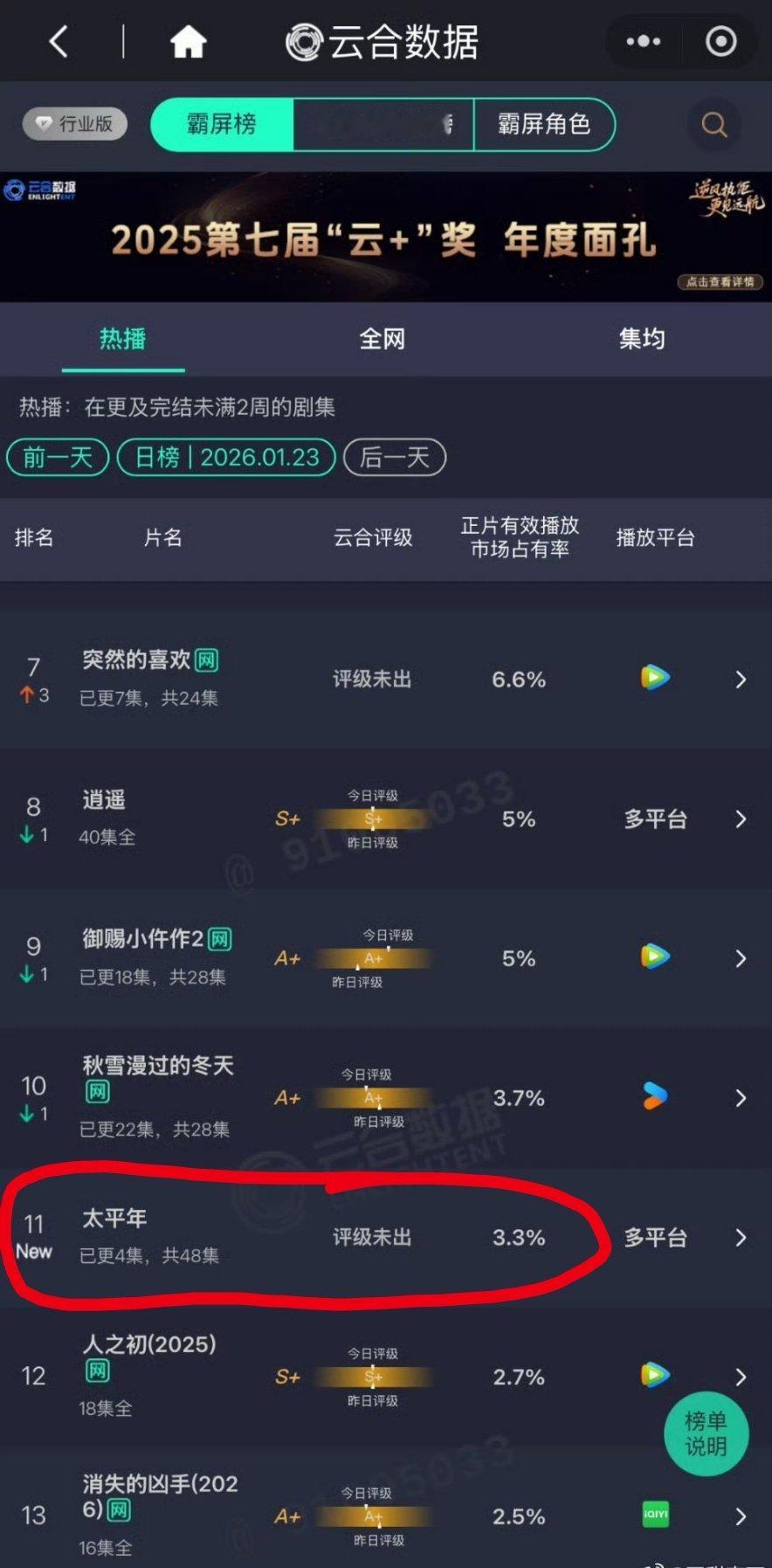 太平年这酷云实时收视率可能要创造历史了,历史最低~